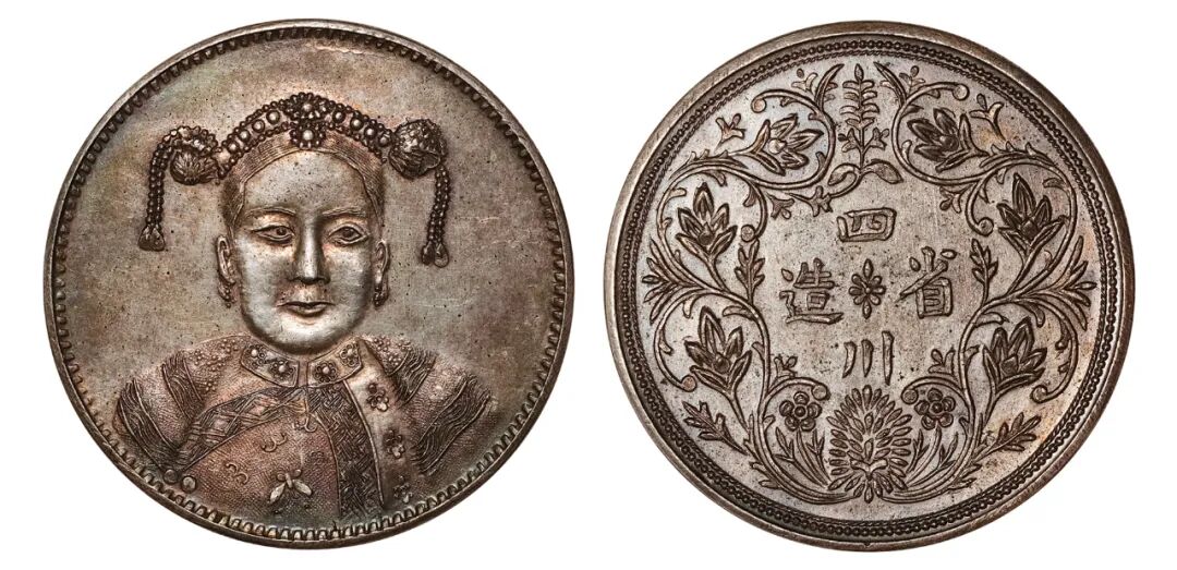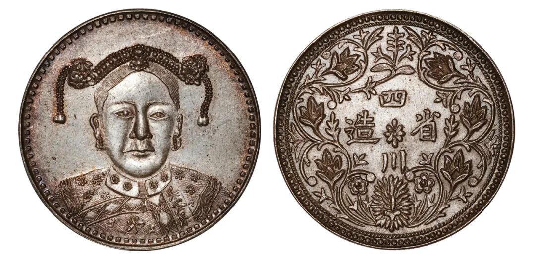 说明:四川卢比是清代唯一流通过的帝王像币。除四川光绪帝像卢比外,存世还有一种慈禧太后像的四川卢比。此版本银币背面和流通的四川卢比背面如出一辙,可能未经流通使用。
