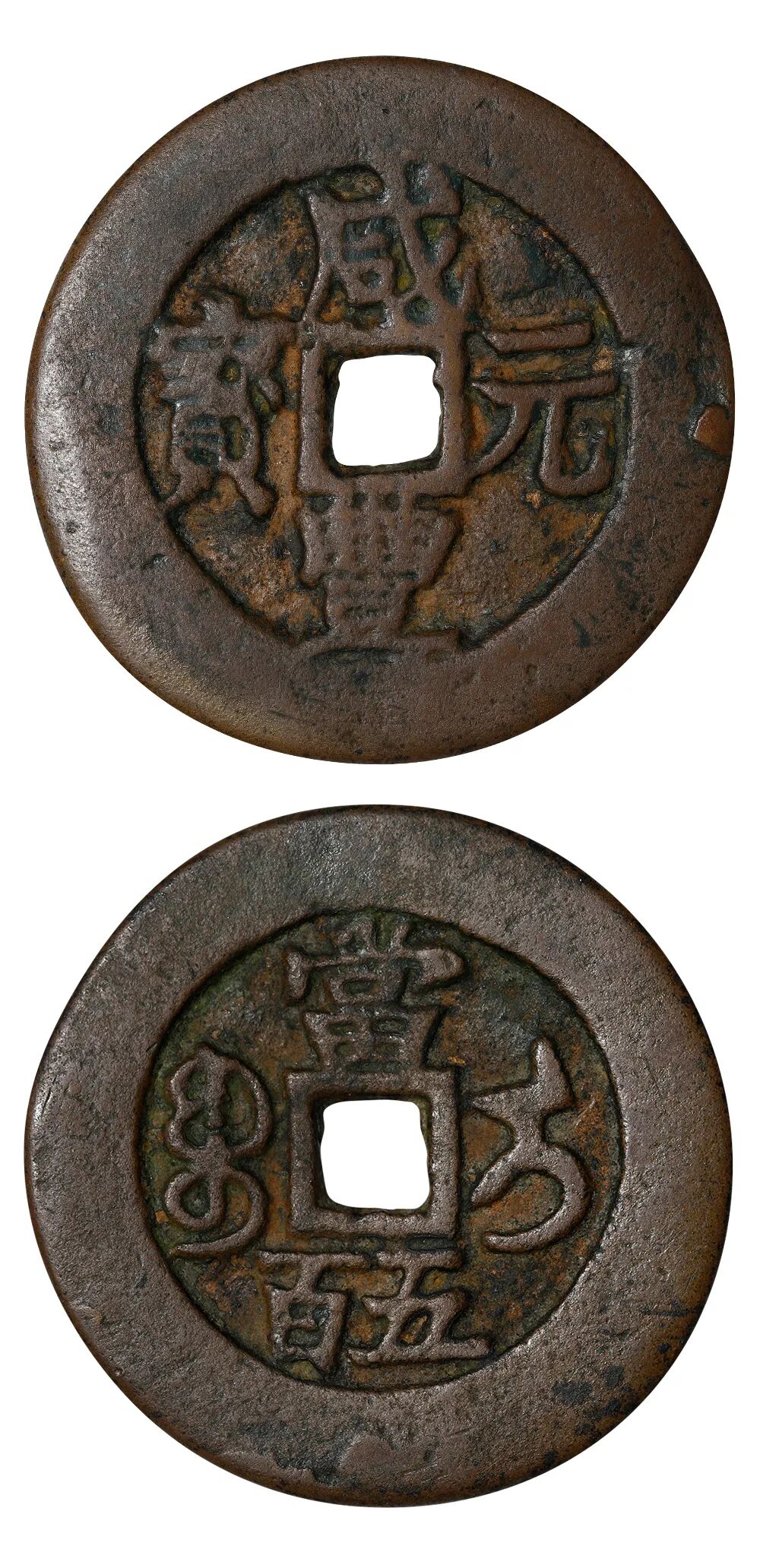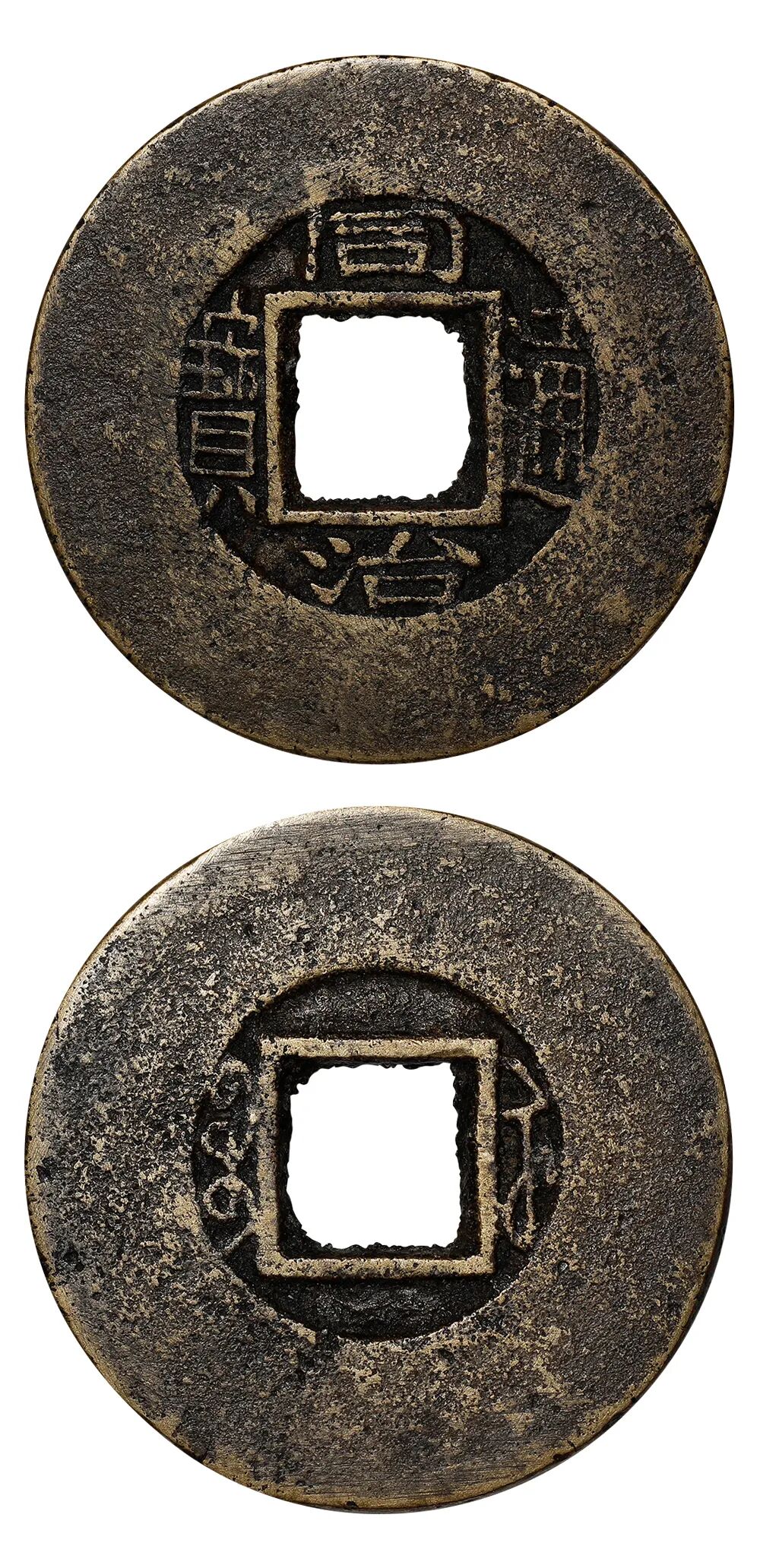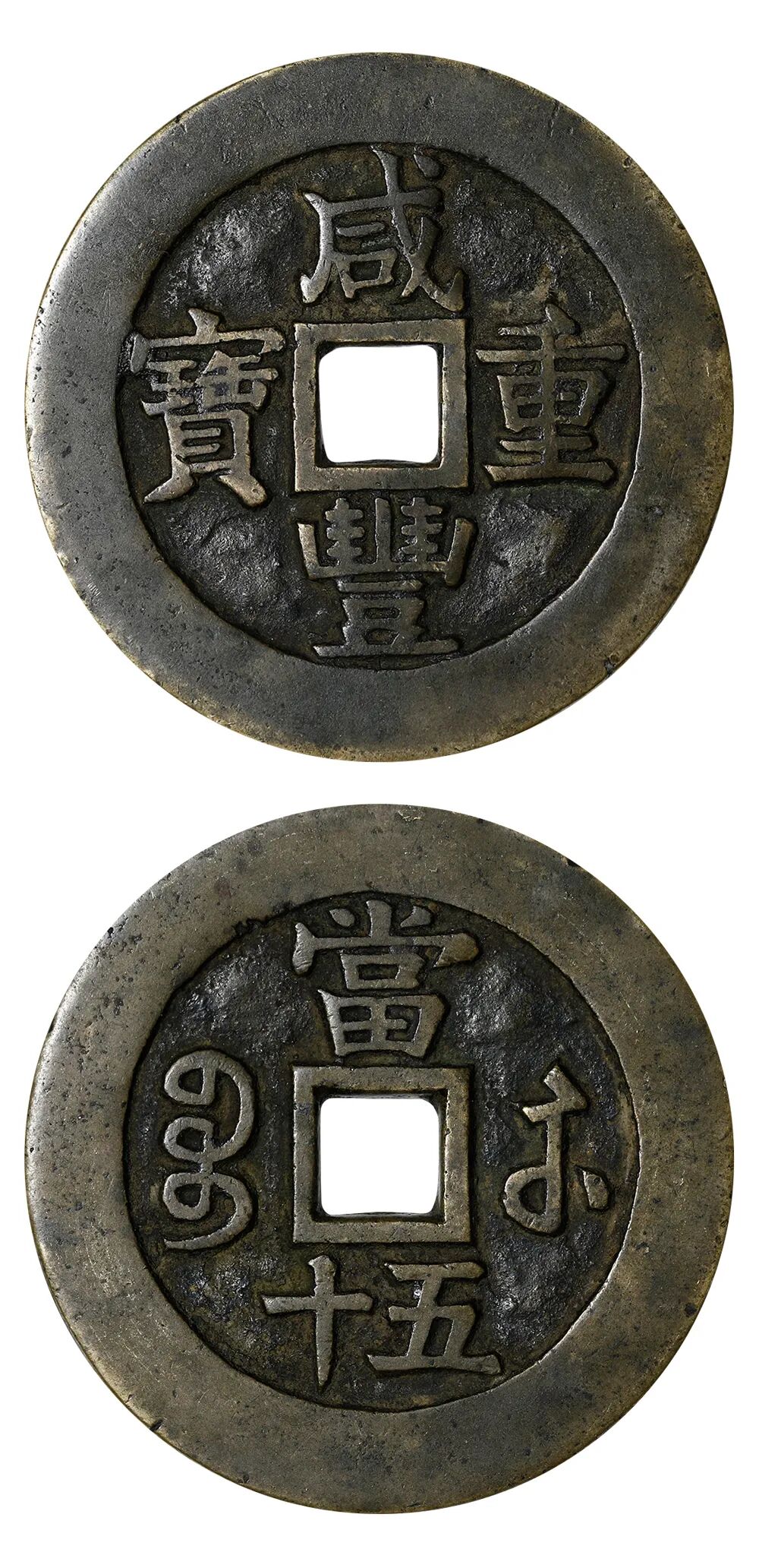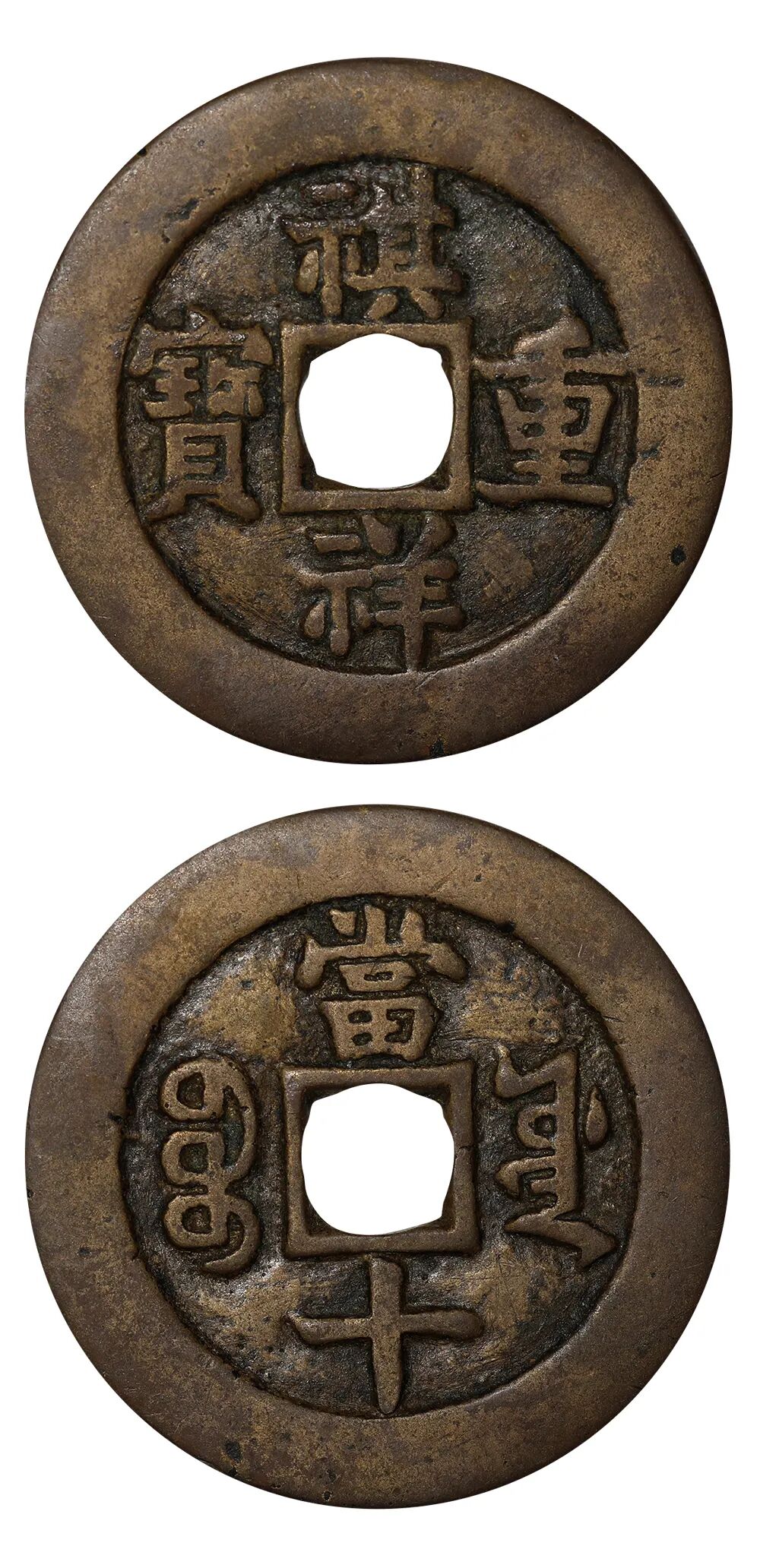 说明:此版文字俊秀,咸从勾,宝从缶,钱径硕大,铜质精黄,通体精修打磨,应为苏州总局(南局)之进呈样钱。此钱前谱未有收录,迄今所见二枚。此版直径达57.86毫米,目前发现勾咸缶宝呈样钱尺寸最大一枚,排名"宝苏当五十十大样钱"之首。