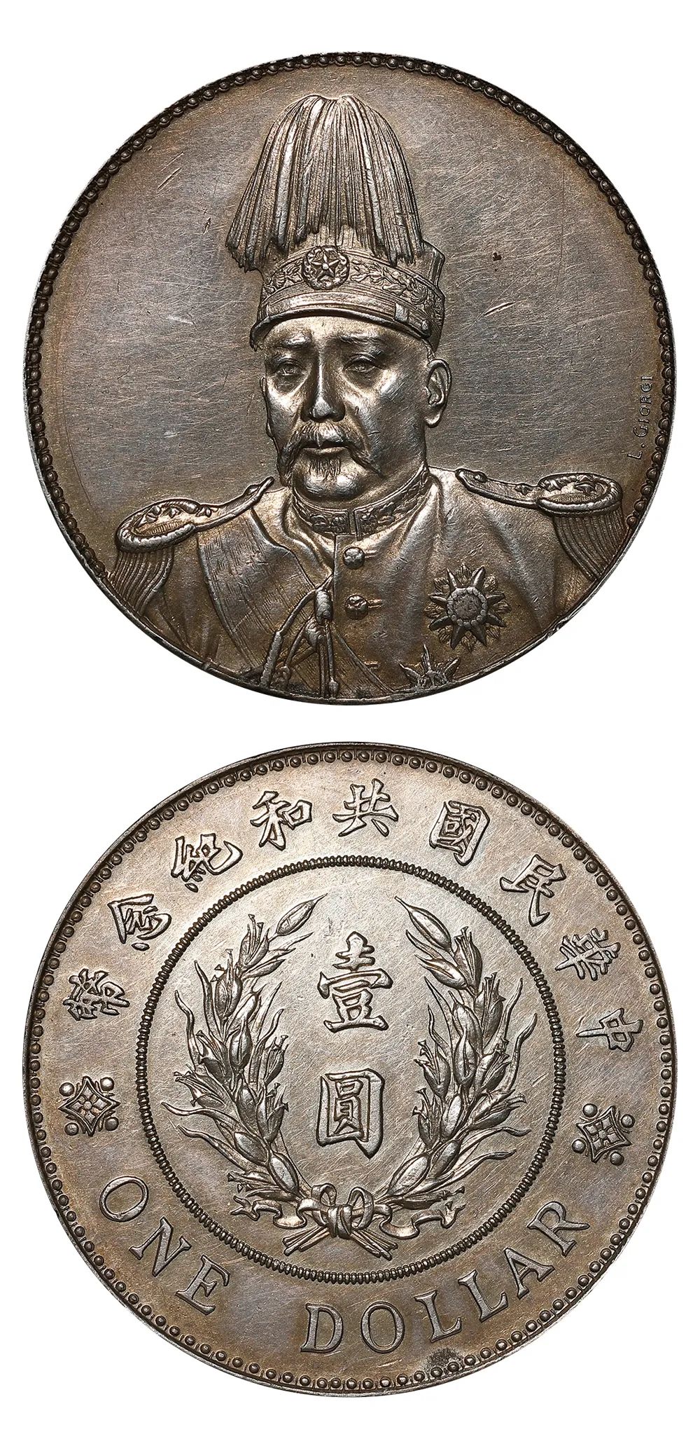 说明:该币由受聘于天津造币厂的意大利雕刻师乔治于民国元年(公元1912年)镌刻压制模具,并由天津造币厂铸造。民国二年(1913年)十月十日,袁世凯正式就任大总统,同时发行此币。
