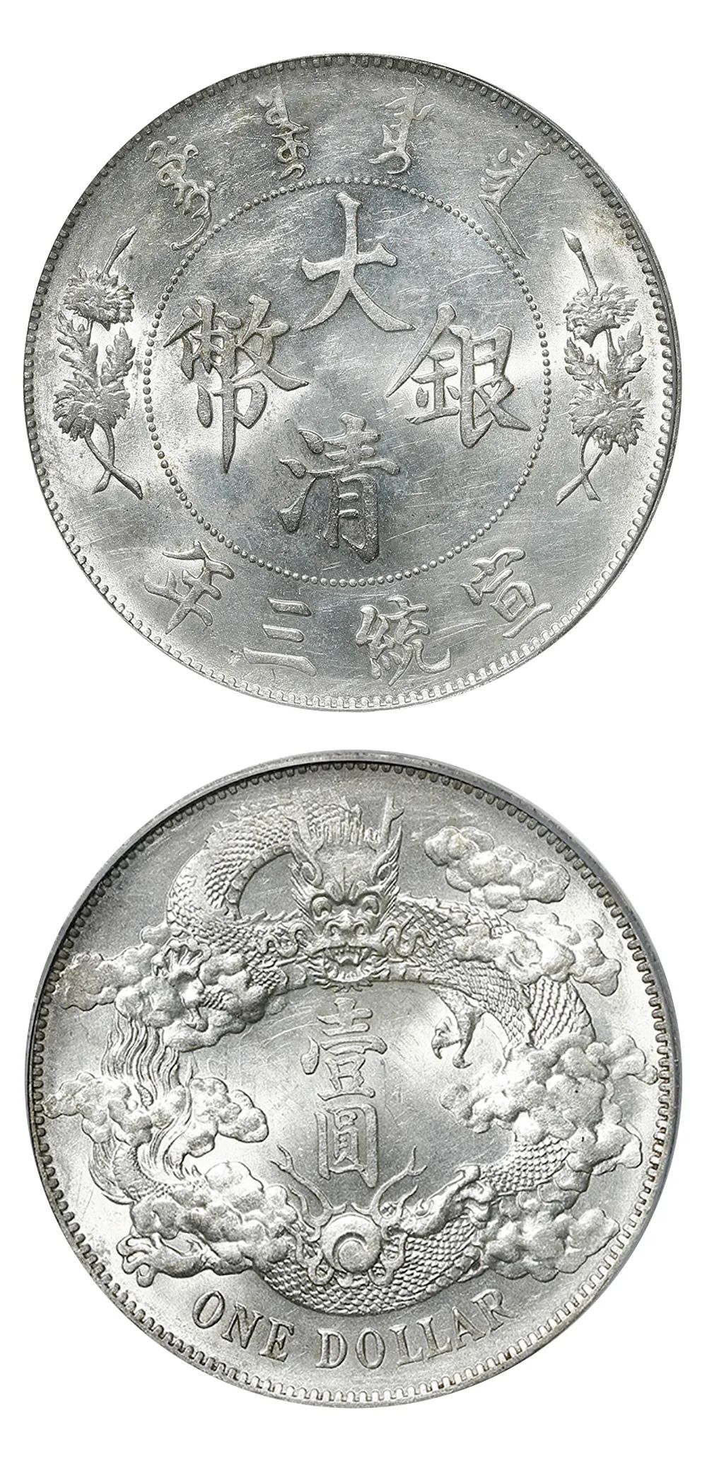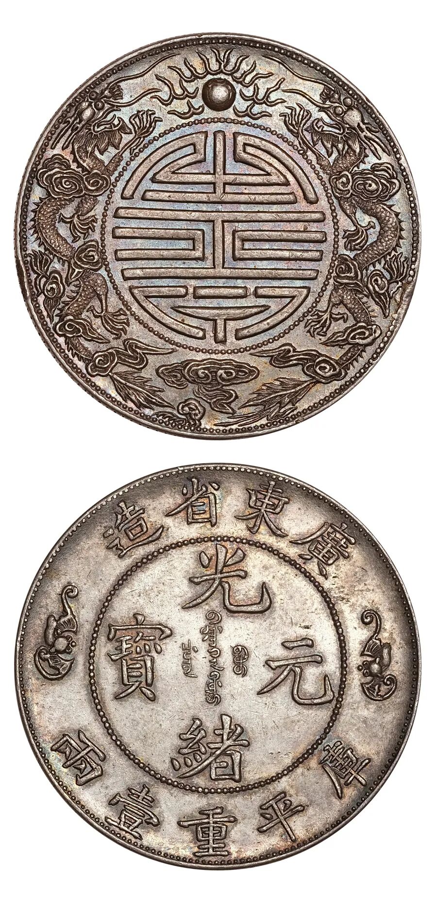 本品通体五彩光泽,正反图案精美,龙鳞饱满,字体纤细挺拔,压力感十足,实为清代银圆精品之作。