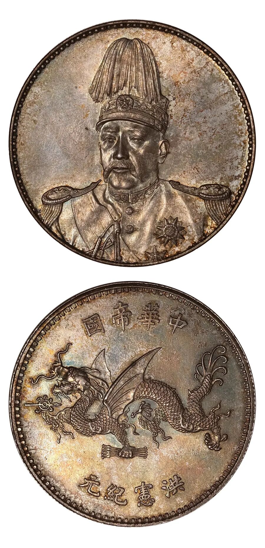 说明:1915年袁世凯复辟帝制,改民国五年(1916年)为洪宪元年,史称"洪宪帝制"。是年设计铸造了袁世凯高缨像中华帝国洪宪纪元飞龙银币。该币由意大利雕版师鲁尔智·乔治雕模,天津造币厂铸造。