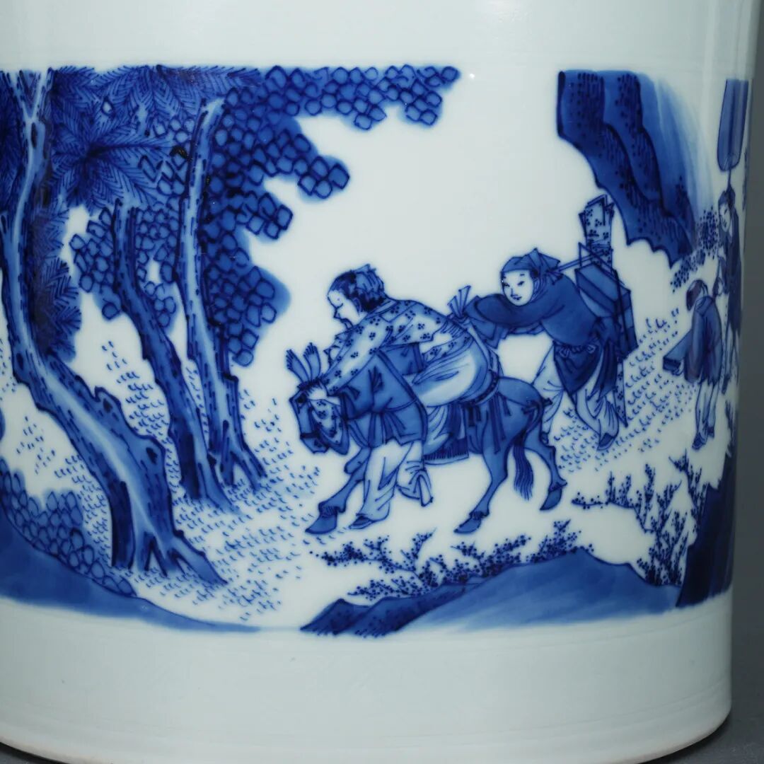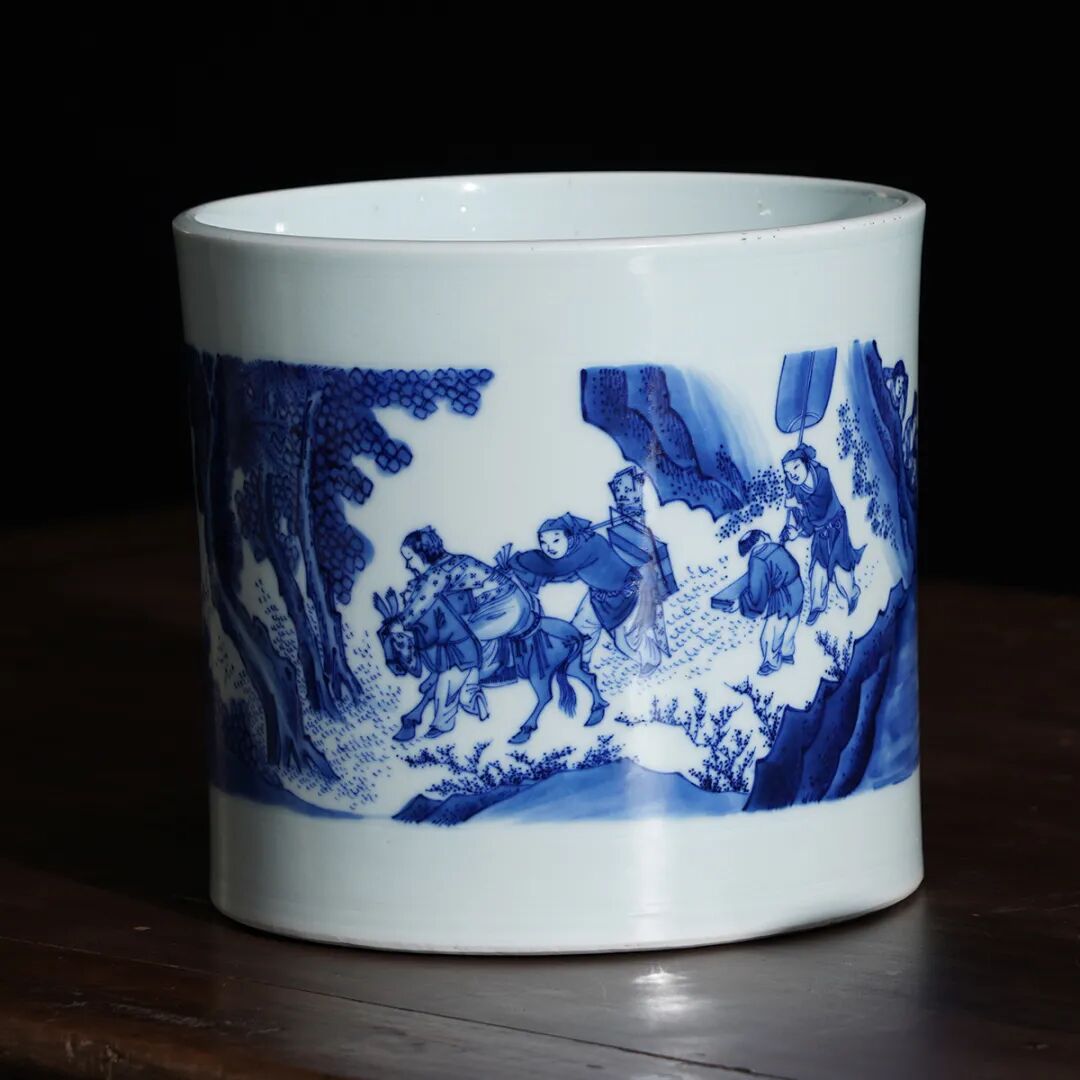 说明:崇祯瓷器既有明代的古拙传统,又具有清代细致缜密的特点,西方人习惯将这类器物年代定位“Transitional”(过渡期),并极为重视。此笔海胎质白润坚细,绘画笔法具有明代风韵,但格调已呈新颖。釉色白中闪青,青花发色明翠。其上绘人物故事图,人物各具情态,远山层次分明,近处云雾缭绕,加之繁疏有致的布局,使全景犹如连绵不绝之山水长卷,笔法娴熟,画意生动,青花发色鲜丽明快,具有明、清交替的时代特征。口沿及近足处暗刻纹饰一周,俗称“暗花边”,此种装饰手法在天启、崇祯时期颇为流行,为崇祯青花上品。