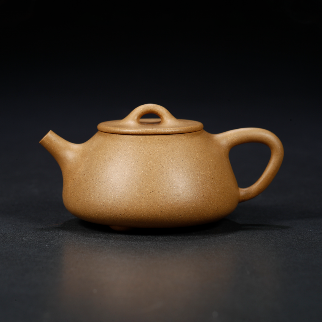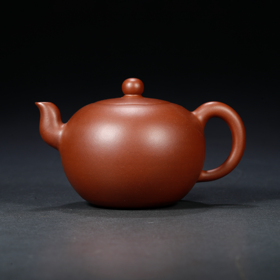 一粒珠壶为曹婉芬女士十分擅长的器型,此型以光润素雅而见长,讨人欢喜。此壶胎质细腻平滑,壶名一粒珠深切其形,壶身一大珠,壶钮一小珠,可谓珠圆玉润。壶嘴位置上提,自壶肩而出,从视觉上进一步增添了圆润、光洁之感,堪称圆器中的典范。