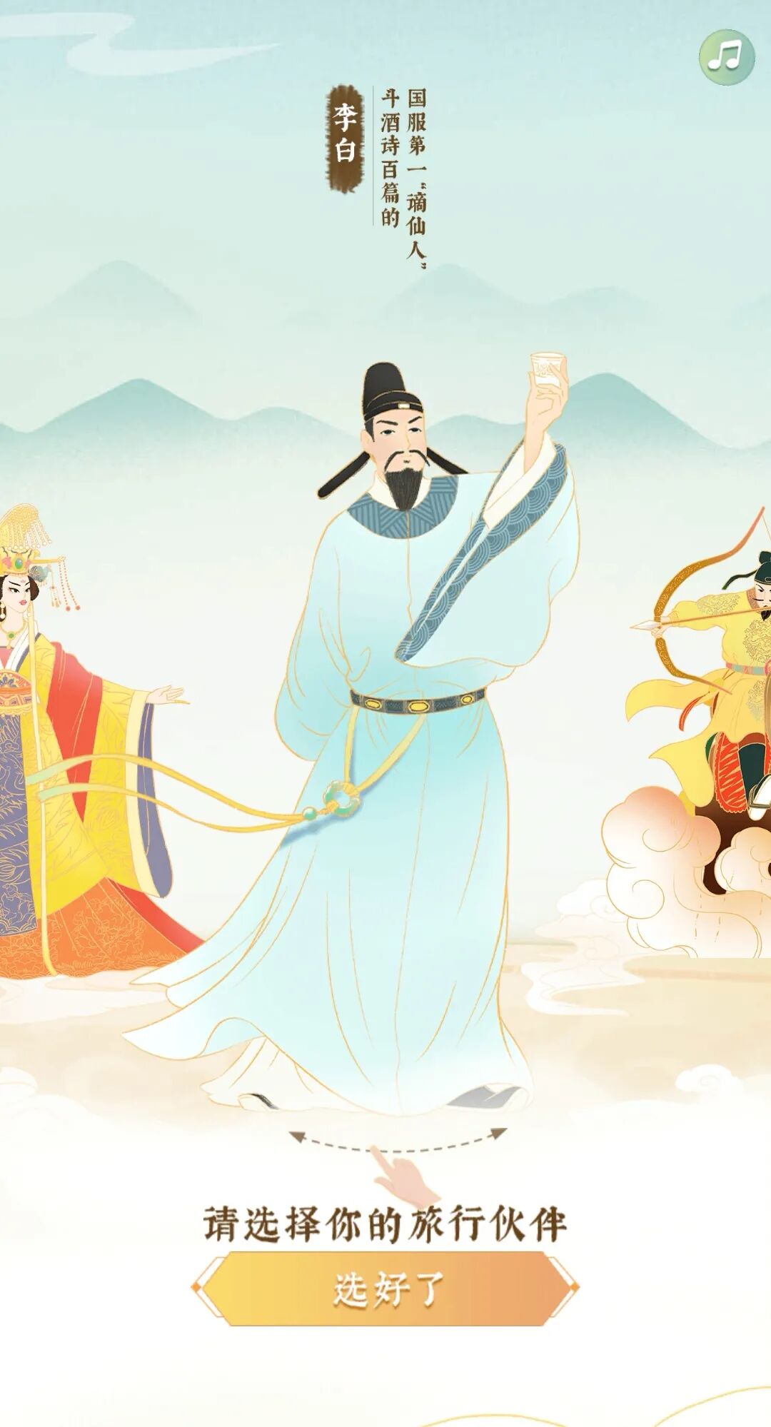 你选择了大唐盛世。再回过神来,面前不知何时站了三个人,他们对你微笑,骑马的中年男人不怒自威,高举酒杯的诗者如同谪仙,尊贵无比的女皇扬起黄袍。你猜出这分别是李世民、李白、武则天。