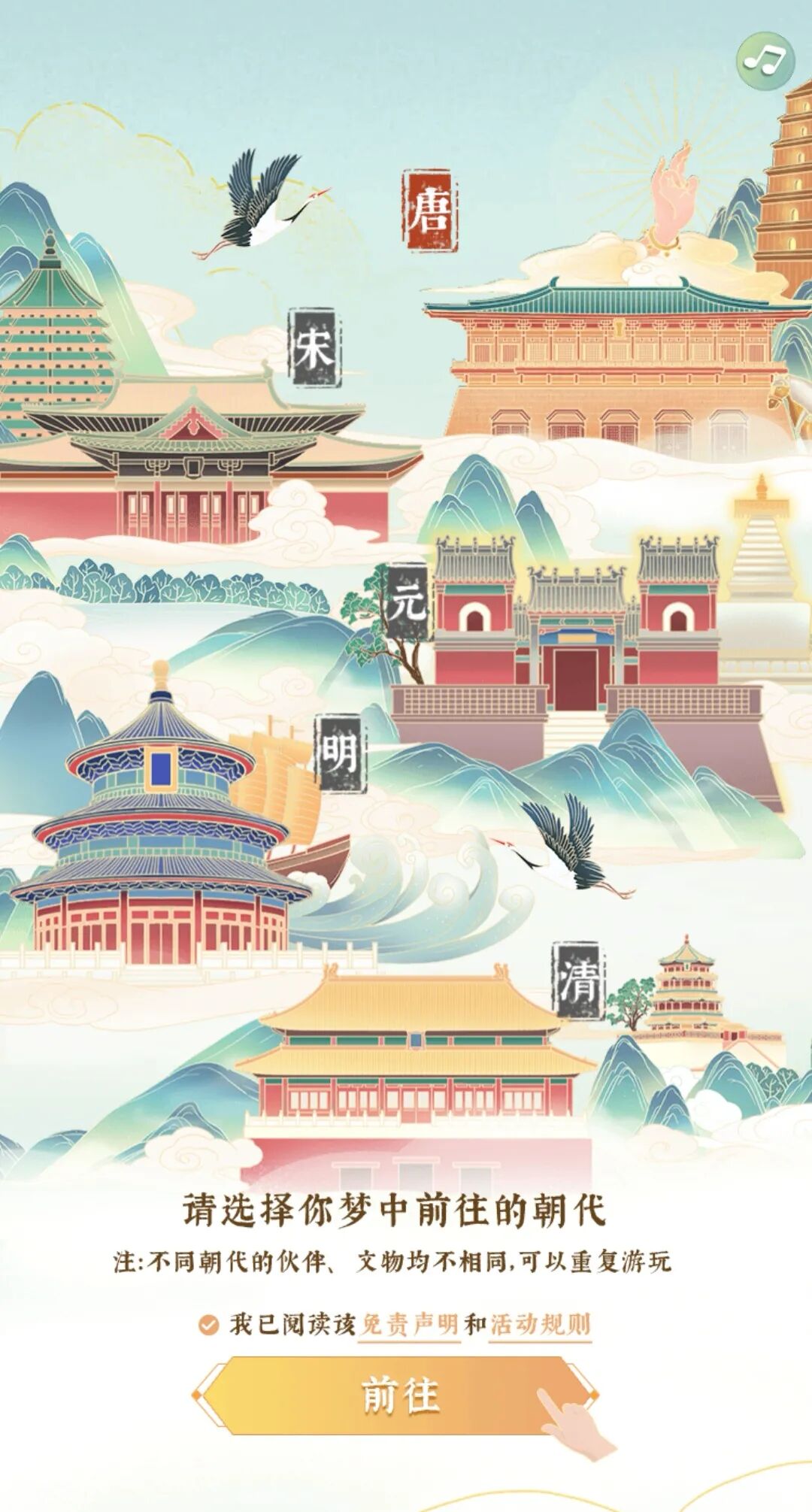 你睁开了眼,面前一道强光闪过,发现自己正身处奇妙的梦境时空中。在云雾缭绕的深处,你看见微微亮起的不同朝代建筑,分别是唐、宋、元、明、清。