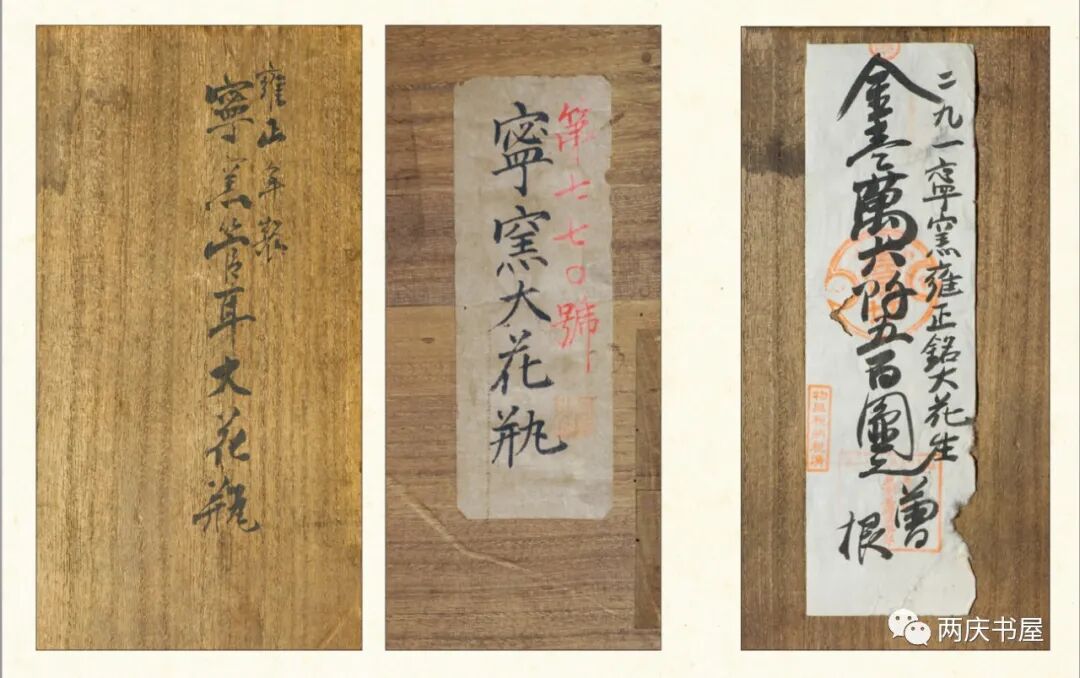 此外,在木盒上所见的“宁窑”,源自明治时代“年窑”一词传入日本时,因发音相近,讹为“宁窑”。近代,日本对“宁窑”的称呼还发生了一系列转变,起先仅指清朝雍正官窑,后则泛指清朝各朝烧造的各类青瓷釉瓷器。雍正之后又过了约两百年,年窑瓷器这一称呼以这种令人意想不到的形式传至日本,词汇语义也扩大了内涵意义,这一点饶有趣味。