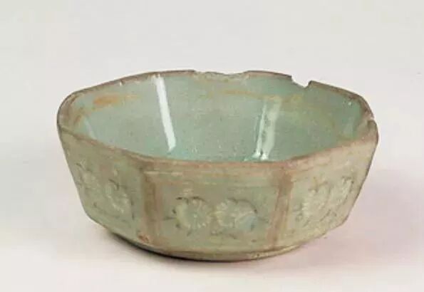 八角折腰形,主题纹饰为菊花纹。釉色青翠,制作规整。