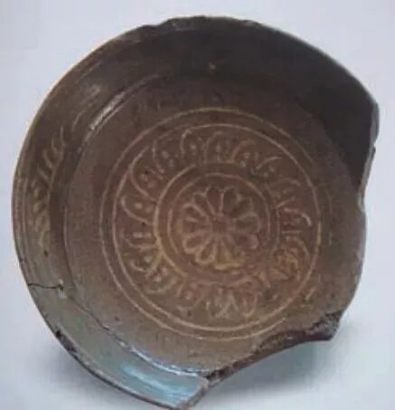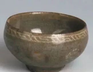 其一,青釉,灰胎,内外满釉。碗内心 3 处支钉痕,足底白色窑砂,镶嵌水波纹和联珠纹。