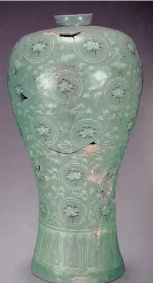 1994 年河北省石家庄市后太保元代史氏墓群出土镶嵌青瓷云鹤牡丹纹梅瓶。盘口,丰肩,下部收敛 ,底足外撇,圈足极矮。胎色灰白。釉色翠绿,细碎开片,工艺精湛。梅瓶是在 M1 出土,墓主人为史天泽。