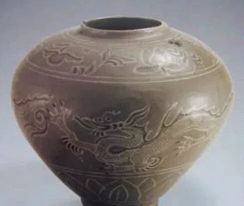 1960年安徽省滁县出土镶嵌青瓷龙纹罐。直口,丰肩,下收,圈足。镶嵌牡丹纹、龙纹、莲瓣纹,以龙纹为主题。胎灰白色,质地坚硬。釉色青中泛黄。