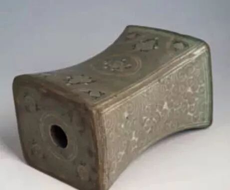 镶嵌青瓷菊花纹枕,1 件。1964 年辽阳县兰家乡石灰窑村出土。长方束腰形,镶嵌折枝菊花和卷草纹。胎呈灰色。