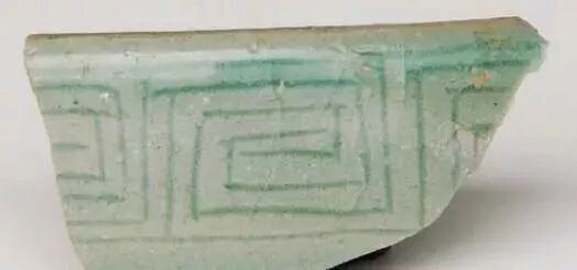 1993 年浙江省宁波市东渡路元代文化层出土镶嵌青瓷花卉纹残片。饰牡丹、蝴蝶、卷草纹等。胎骨坚硬。釉色粉青,釉面光润。在宁波东渡路“市舶司”遗址还出土了镶嵌青瓷人物罐盖残图案呈六角形状,镶嵌菊花纹,中间还有两名男子在扭打。