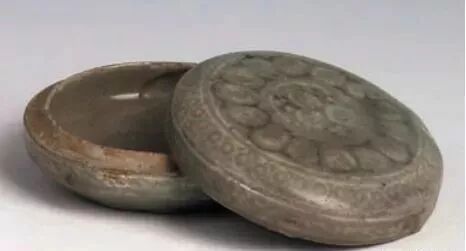 镶嵌青瓷菊花纹盒,1 件。1971 年辽阳市北园 5 号墓出土。平盖,直壁,腹下斜,浅圈足。镶嵌菊花纹、几何纹。胎体厚重。