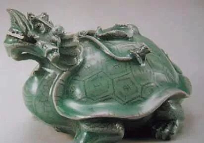 2003 年内蒙古自治区集宁路元代城址出土青瓷龙首龟身砚滴。龙首高昂,褐彩点睛,口衔莲花,背部有一注水孔。釉色青翠 , 造型独特 , 制作精良。