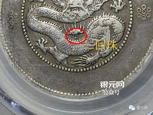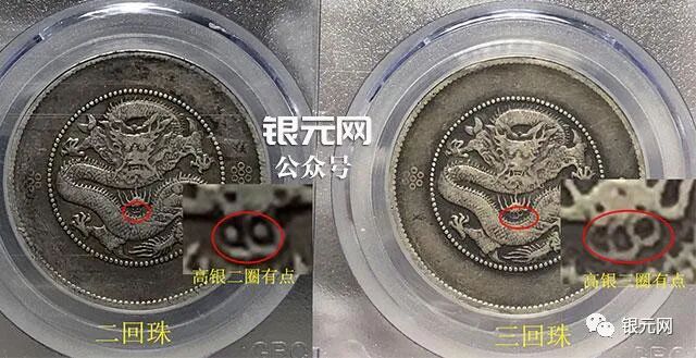 二回珠和三回珠都是云南新龙半圆的一个版别,主要区别就是银币背面的龙火焰处高银二圈有点,另一个是高银三圈有点,(也就是一个是有两个珠子,一个是有三个珠子),大家可以清楚的看到它们的区别。