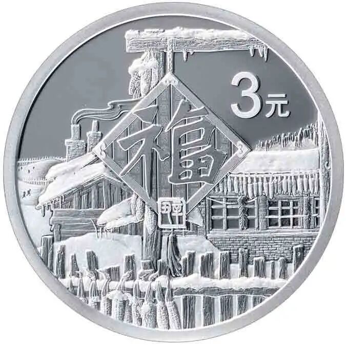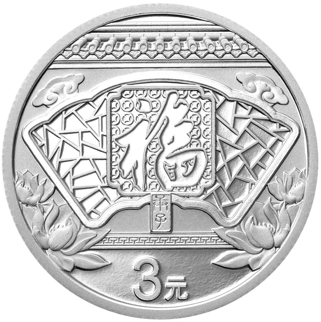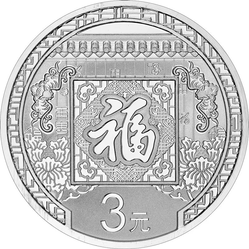 8克圆形银质纪念币背面图案为明代文征明的“福”字造型,配以窗格、剪纸团花、喜鹊、梅花、民居房檐等造型组合设计,并刊“壬寅”字样及面额。