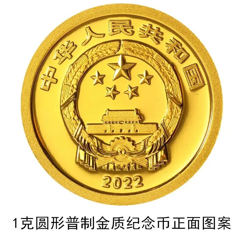 1克圆形金质纪念币正面图案均为中华人民共和国国徽,并刊国名、年号“2022”。