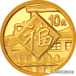 1克圆形金质纪念币背面图案为明代文征明的“福”字造型,配以窗格、梅花、民居房檐等造型组合设计,并刊面额。