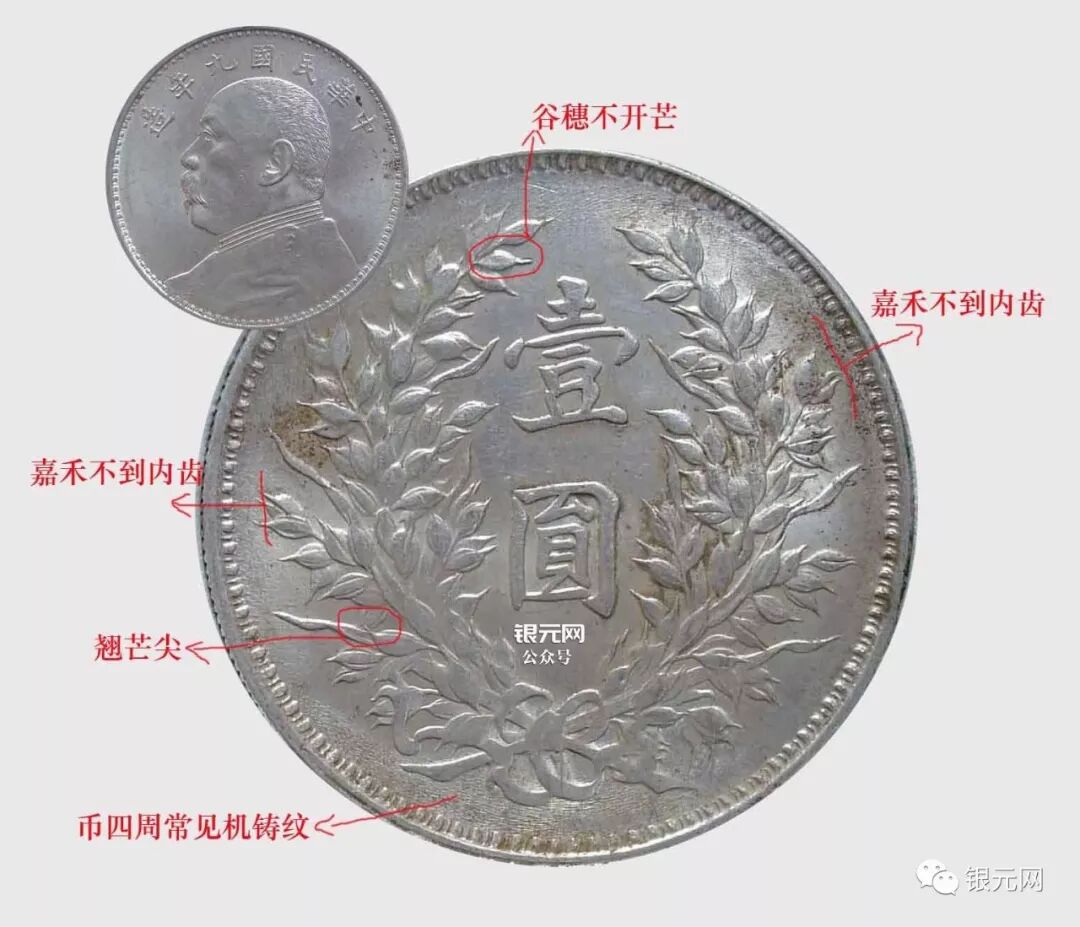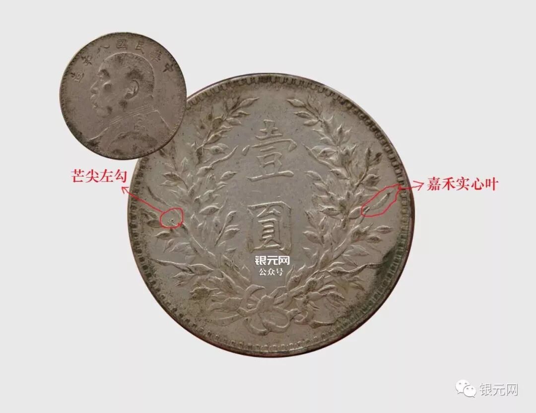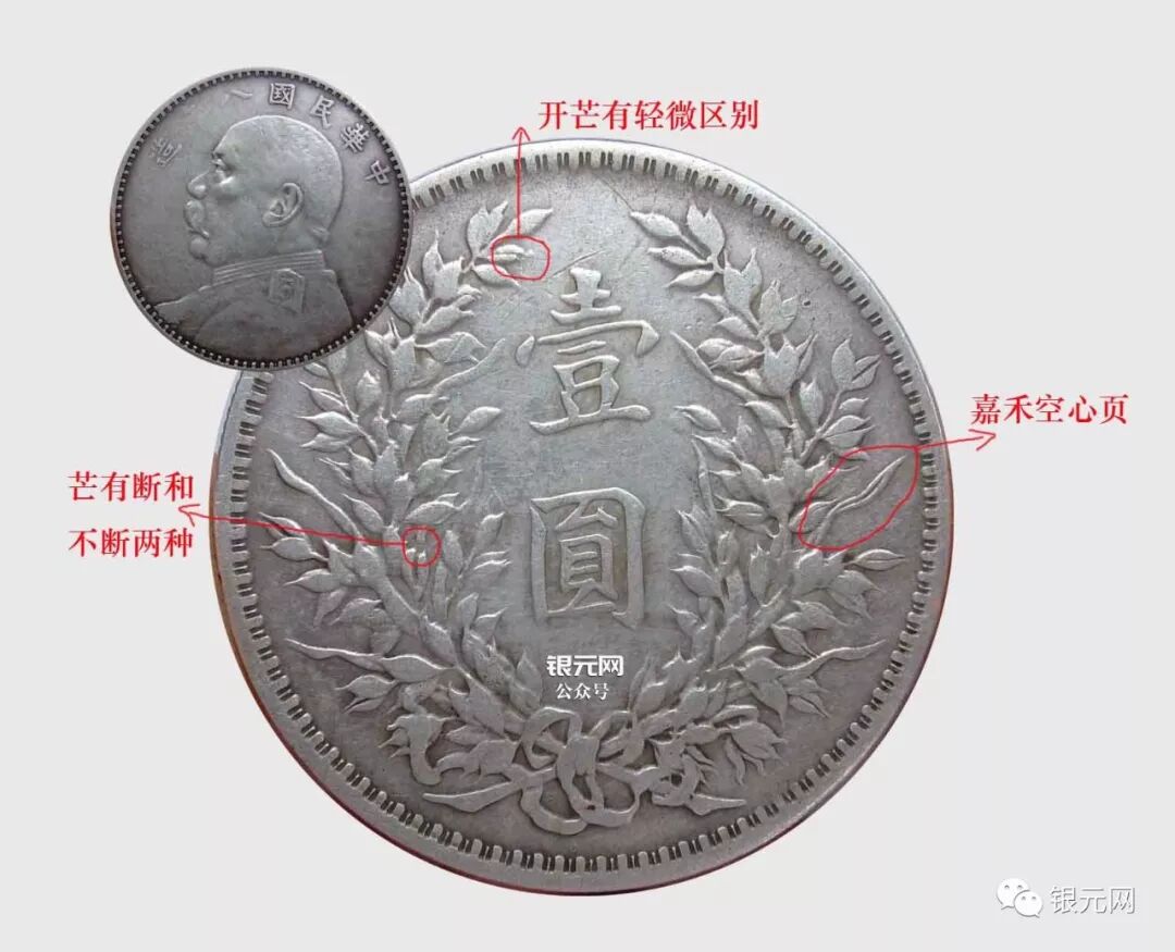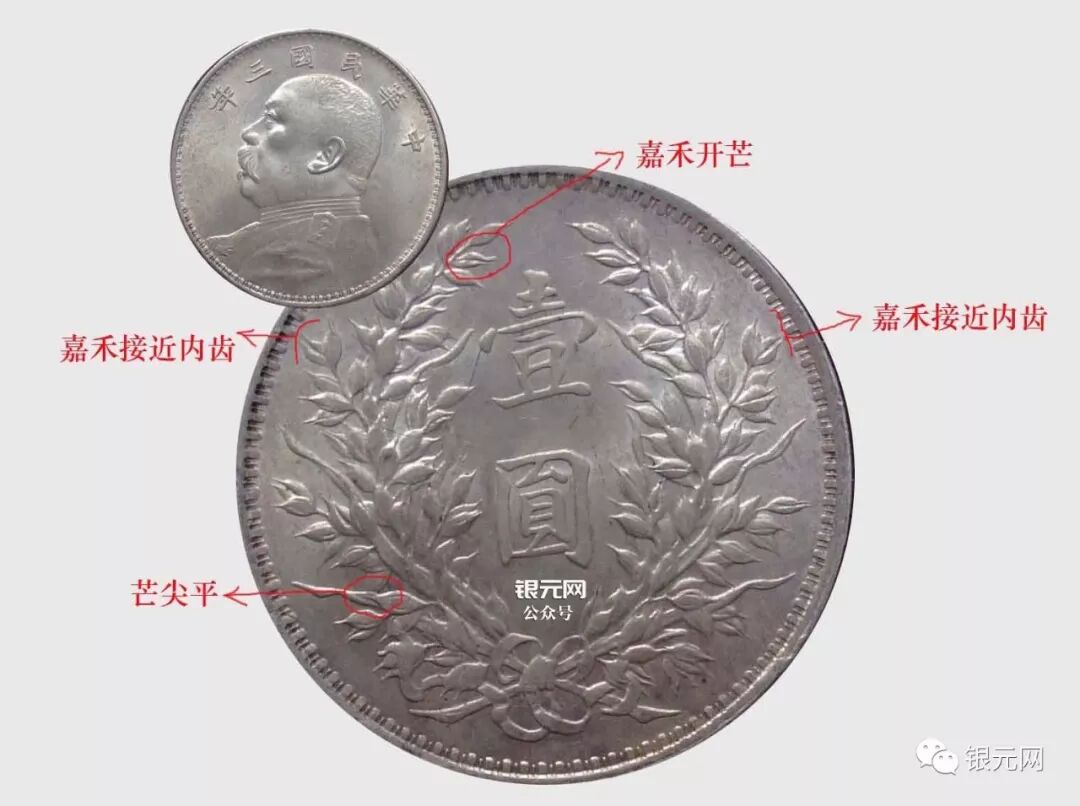 嘉禾做为大头组成的主要一部分,在版别区分中举重轻重,特别是在不同年份的混配中~所以了解官版里四个年份最普通嘉禾面的区别对一个银元版别爱好者非常重要,币都不是我的了,都是借图~~