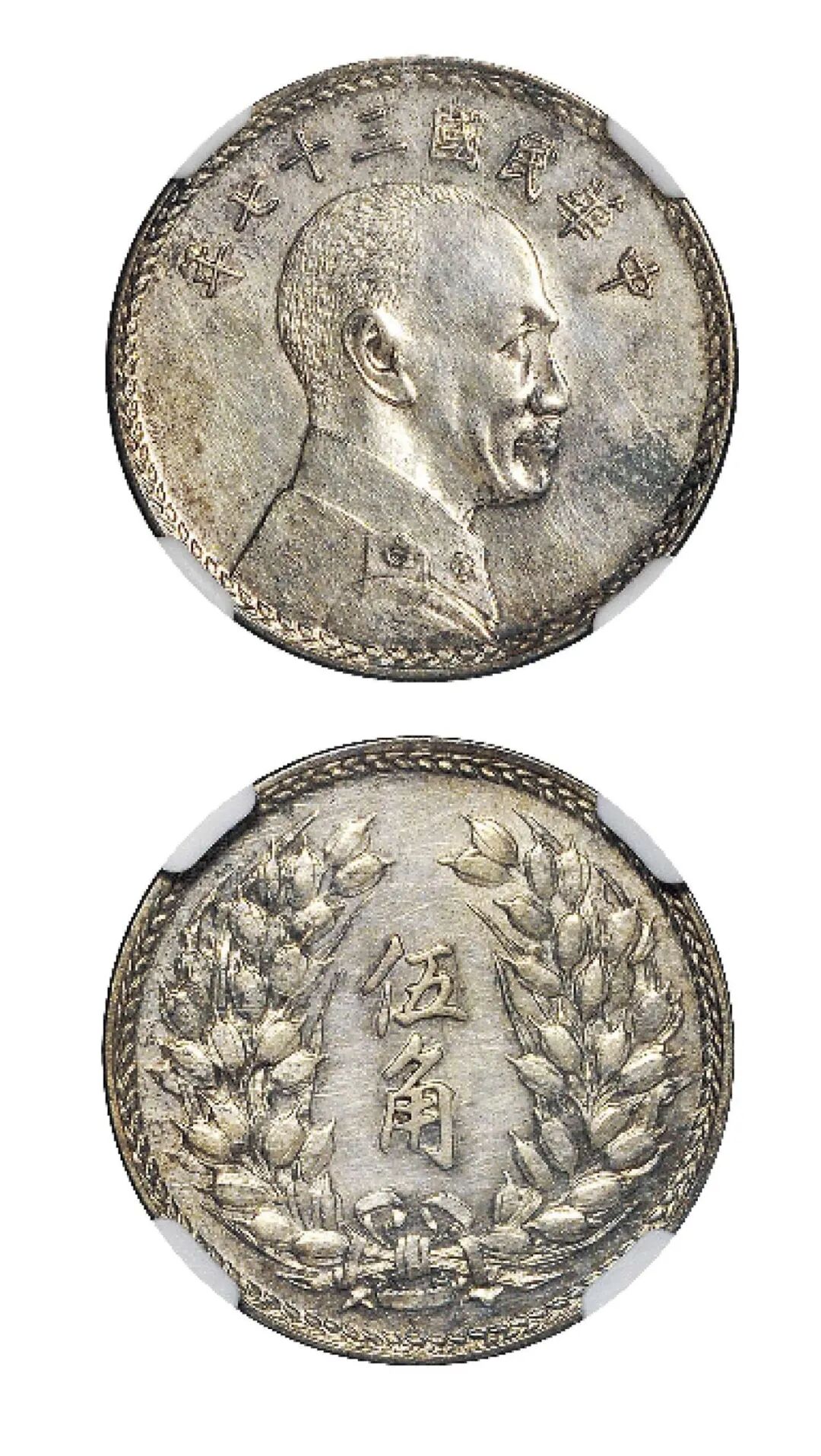 简介:民国三十七年蒋介石像伍角银币,K-698/LM-122,上海中央造币厂试铸,未发行,存世稀少;拍品雕刻精美,原铸银光,品相颇佳,资深钱币专家陈吉茂藏品,NGC-ACAB MS61