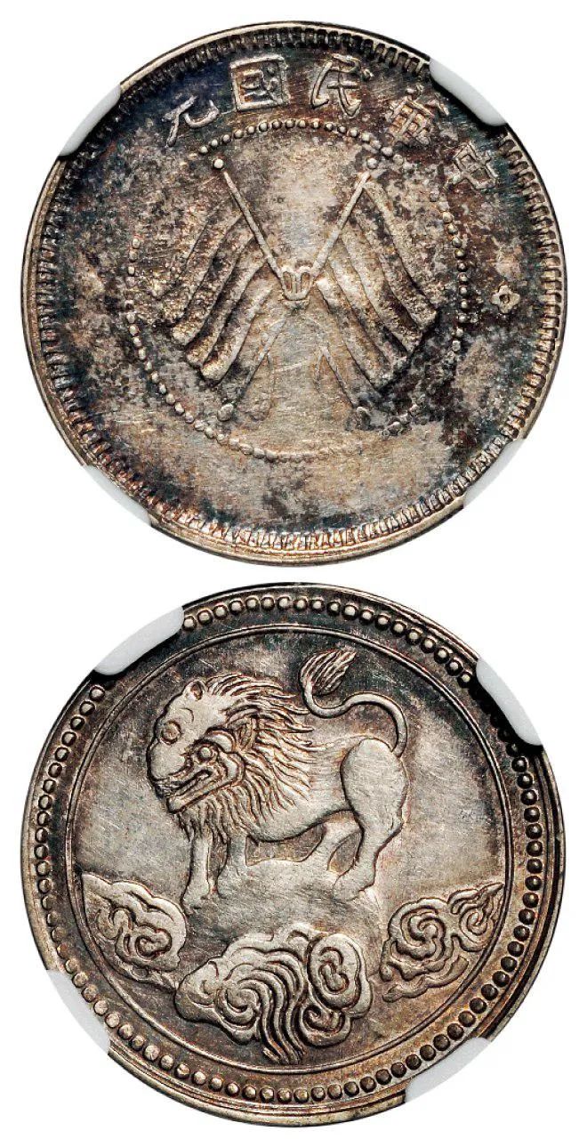 醒狮铜币系尹昌衡平定康藏地区叛乱回师主川后铸造,正面珠圈内为两面交叉的五色旗,珠圈上为纪年“中华民国元年”,背铸雄狮地球图,下方饰有云朵。根据狮子的形态分类,版别可有俯首狮、仰首狮、首尾相连狮等,最大特点是未标明面值,但直径、重量均与五文铜元无异。据耿爱德《中国币图说汇考》记载,同样版模铸币也发现有银质者存世,价值应相当于贰角,极稀少,可能曾流通于川藏边界地区。
