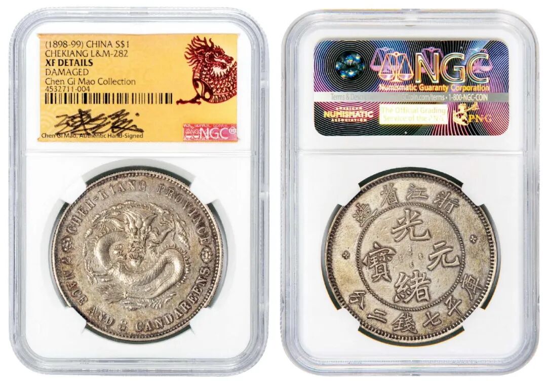 简介:1899年浙江省造魏碑体光绪元宝库平七钱二分银币一枚,Y-55/LM-282,浙江省银圆局铸,浙江魏碑版银圆所见多为辅币,“一圆”主币流传极罕,迄今存世未逾十枚,属清代龙洋之珍稀品,历来为藏家孜孜以求,极为珍贵,资深钱币专家陈吉茂藏品,NGC-ACAB 陈吉茂签名 XF Details