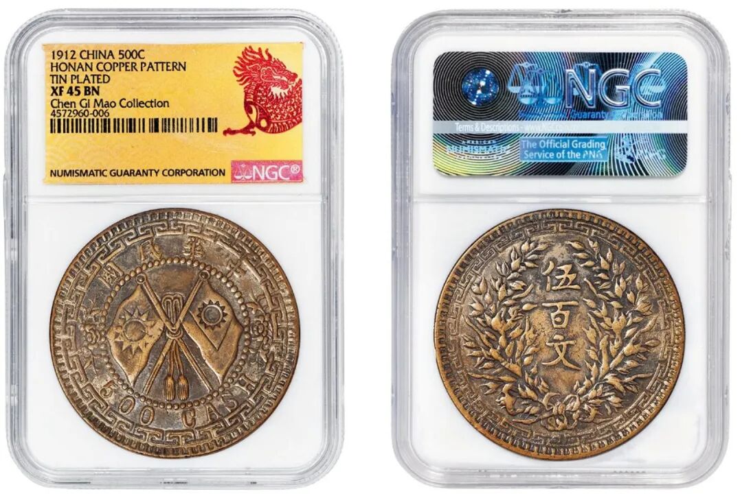 简介:1912年中华民国河南双旗嘉禾伍百文铜币试铸样币,CCC-559/CL-HON.69,镀锡版,直径:45.2毫米,厚:3毫米,重量:37.5克,是中国机制铜元尺寸最大、面值最高者,未正式发行,存世品皆属试铸样币,为泉界公认的铜元珍品,目前已知存世仅十余枚,镀锡版仅占三分之一,且所见多有腐蚀,保存完整者十分难得,资深钱币专家陈吉茂藏品,NGC-ACAB XF45BN