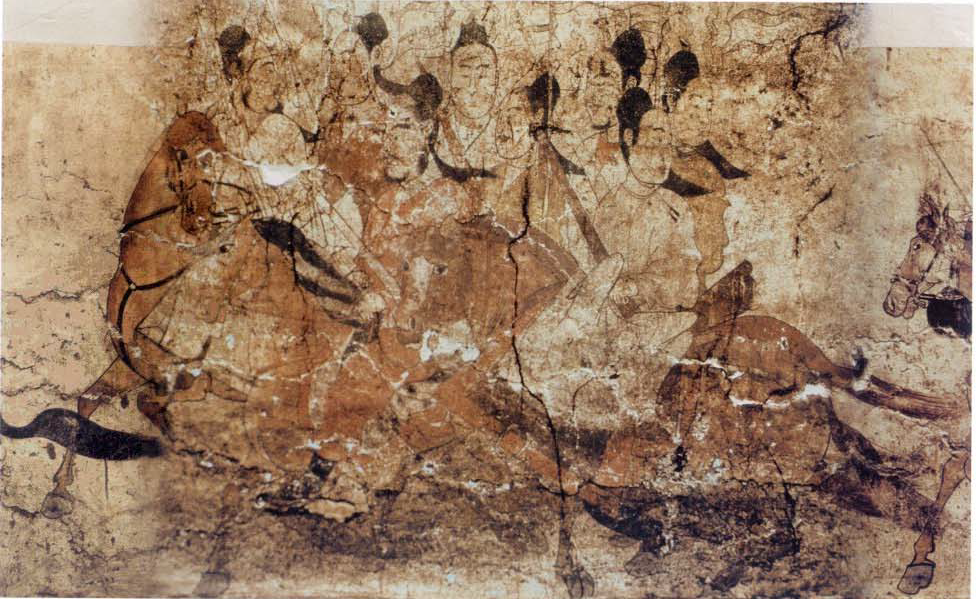 北朝娄睿墓《鞍马游骑图》局部目前发现的北魏帝陵集中于洛阳北邙,民间向来有“生在苏杭,死葬北邙”的说法,可见这里确是一块风水宝地。目前,由各代王侯将相墓构成的邙山陵墓群有970多座,其他古墓葬更有数十万之巨。然而,北魏最著名的陵园并不属于洛阳。位于平城(大同)的冯太后永固陵夺得了这个地位。她结合鲜卑“凿石以外祖宗之庙”的习俗,恢复了两汉时在墓前建殿的传统,并在陵园内加盖佛堂,宗教元素第一次进入帝后陵园之中。除此之外,其墓室结构与曹操高陵相似,甚至更加简化,删去了主室两边的侧室。在之后位于北邙陵区的北魏帝陵建造中,规制虽略有变动,但大体上可以说继承了永固陵的基本规制。北魏东西分裂后,开始出现地域性特点。西魏-北周帝陵以天井、壁龛数量彰显地位;东魏-北齐帝陵则以墓内满饰壁画为特点。图源:陕西省考古研究所、咸阳市考古研究所《北周武帝孝陵发掘简报》