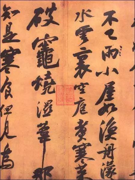 用笔有轻重,字体有大小,几乎是很多名家书法的一大特点。但同一幅作品中,字体大小悬殊之大者,苏轼书法可谓独树一帜。如《寒食帖》中“哭涂穷”三字。这三字所占比例,比前一行中五个字所占的比例还大。这种字形大小悬殊给人视觉上极强的冲击力,实际上也表达了当时书写过程中的一种强烈的情绪。这种情况,在《武昌西山诗帖》中也有体现。
