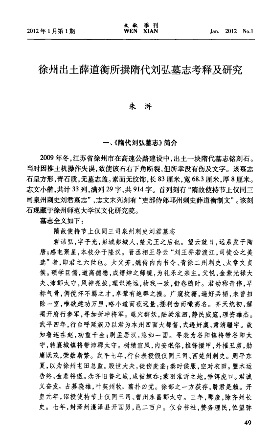 2009年冬,江苏省徐州市在高速公路建设中,出土一块隋代墓志铭刻石。当时因推土机操作失误,致使该石右下角断裂,所幸没有伤及文字。该墓志石呈方形,青石质,无墓志盖。素面无纹饰,长83厘米,宽68.3厘米,厚8厘米。志文小楷,共计33列,满列29字,共914字。首列刻有“隋故使持节上仪同三司泉州刺史刘君墓志”,志文末列刻有“吏部侍郎邛州刺史薛道衡制文”。该刻石现藏于江苏师范大学汉文化研究院。