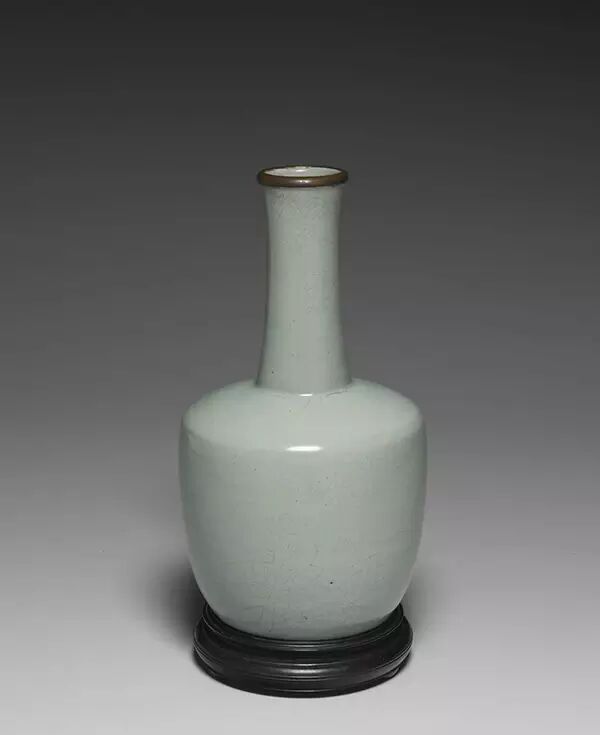 此瓶直长颈、斜宽肩、折为上丰下敛的腹部、平底,底部有五枚细小支钉痕;唯该类瓶型在长颈的上方原应有一平折上扬的盘口,本器的口部可能因伤而平截去,并镶铜棱扣。全器呈腴润的粉青釉色。北宋时代“道尚取乎反本,理何求于外饰”的审美。