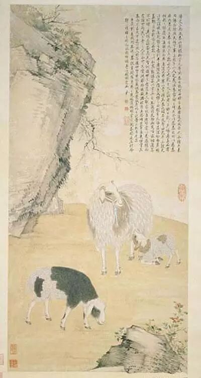 本幅为摹仿明宣宗与郎世宁(1688-1766)同名之作。“三阳”取其谐音写生绵羊三只,母羊与小羊表情动人;配景的花石,用笔自由写意,出自于乾隆朝翰林词臣画家邹一桂(1686-1772)之手。