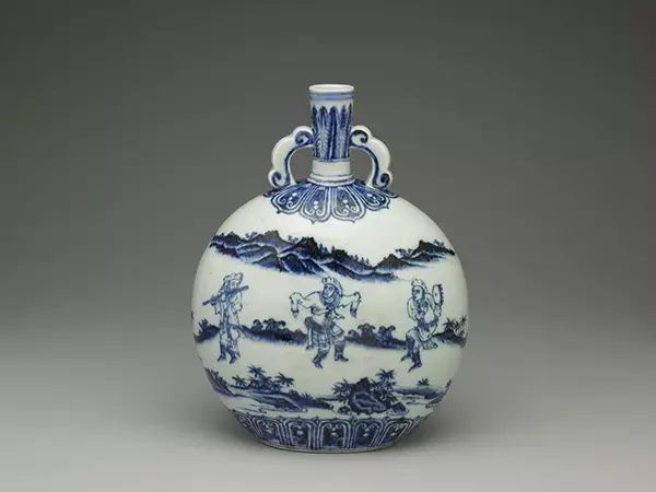 扁壶又称抱月瓶,其型制仿自中东,但装饰纹却为中国式样,山水风景画的绘法为传统水墨形式,只是人物为外邦异族。明代永乐开始,青花瓷器装饰摆脱了元代繁复细密手法,注重留白的视觉效果,白地青花更显其清丽风格,世称明代官窑“永乐人少”,此为永乐官窑中无论釉色、绘画都极为精妙的一幅山水人物图画。