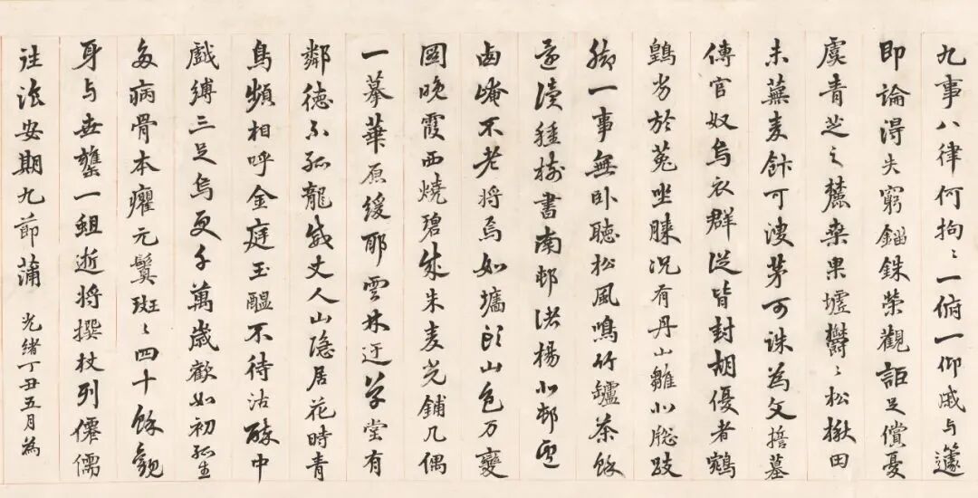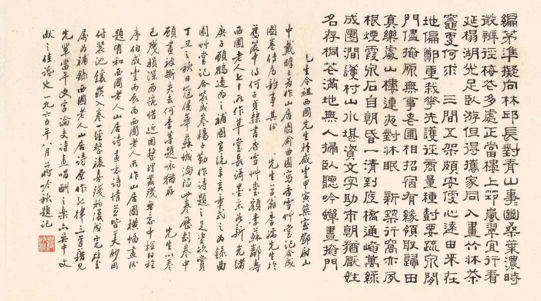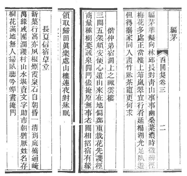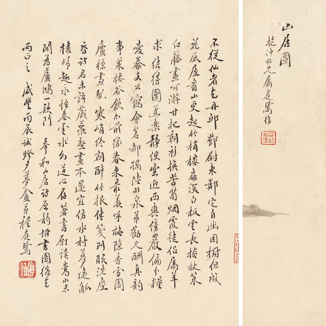 蒋氏是本卷题跋中最的见证者,所以其跋文旨在梳理成卷的来龙去脉,前因后果。主要是丁丑之秋,此卷历劫,卷中顾画被撕失去,又发现程庭鹭所画,因付装池,镶嵌入卷,一经整裱,喜残物复成完璧。受潘季孺的嘱托,蒋吟秋补录程庭鹭画跋中所和的潘遵祁《山居诗》原作七律三首。诗文著录于潘遵祁《西圃集》,三首诗原题分别为《编茅》《偕仲弟宿涧上之瞰云楼》《长夏信宿草堂》。