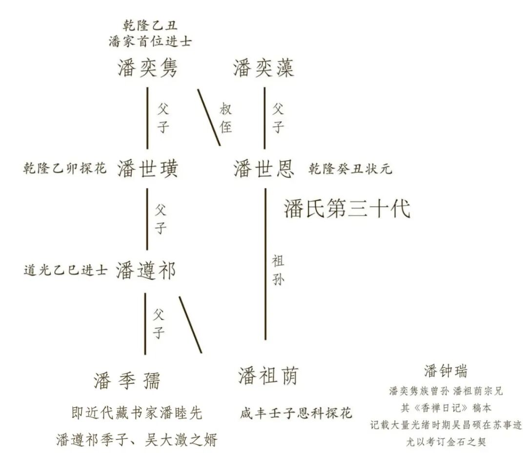作为清代苏州四大巨姓之一,号称“贵潘”的潘氏家族,虽经商有成,但为家族长久之计,孜孜以求博取功名,积四代百年之功,由商户一跃而为簪缨世家。潘遵祁,探花潘世璜之子,潘祖荫族叔,道光二十五年进士,选授翰林院编修。潘氏家族或以科名、或以事功、或以收藏、或以诗词、或以学术著称于世,一步一个脚印,厚积薄发。纵使像潘遵祁这样淡于仕宦,退而不仕,但我们依然可以从其晚年重游泮宫述怀的长文中,看出其对于族人子弟科场连捷的无限自豪。一八五四年,潘氏辞荣归乡。建成香雪草堂,亭台有致,泉石幽深,花木扶疏,俞樾自叹:“曲园与之相比,实犹碛砾之于玉渊。”微生三遇岁朝春,已是艰难历过人,劫后无恙,潘氏流连于三松堂、西圃、香雪草堂间,遍游诸胜,杜绝尘俗,人亦飘飘欲仙,其对时间的感悟,体现在其将历史时间轴与家族心路历程的叠加叙述之中。潘遵祁最小的儿子潘季孺,即近代藏书家潘睦先(1871 - 1963)。号少圃,一号俭庐,官湖北布政司照磨,升知府。其继承世家所遗书,先祖潘奕隽、潘遵祁等,均为知名藏书家。娶吴大澂之女为妻,书香累世。并有养闲草堂藏书处,收藏三松堂旧书不少,其中有黄丕烈校本、题跋善本不下百余种。其藏书毁于日寇侵华战火中。![]()