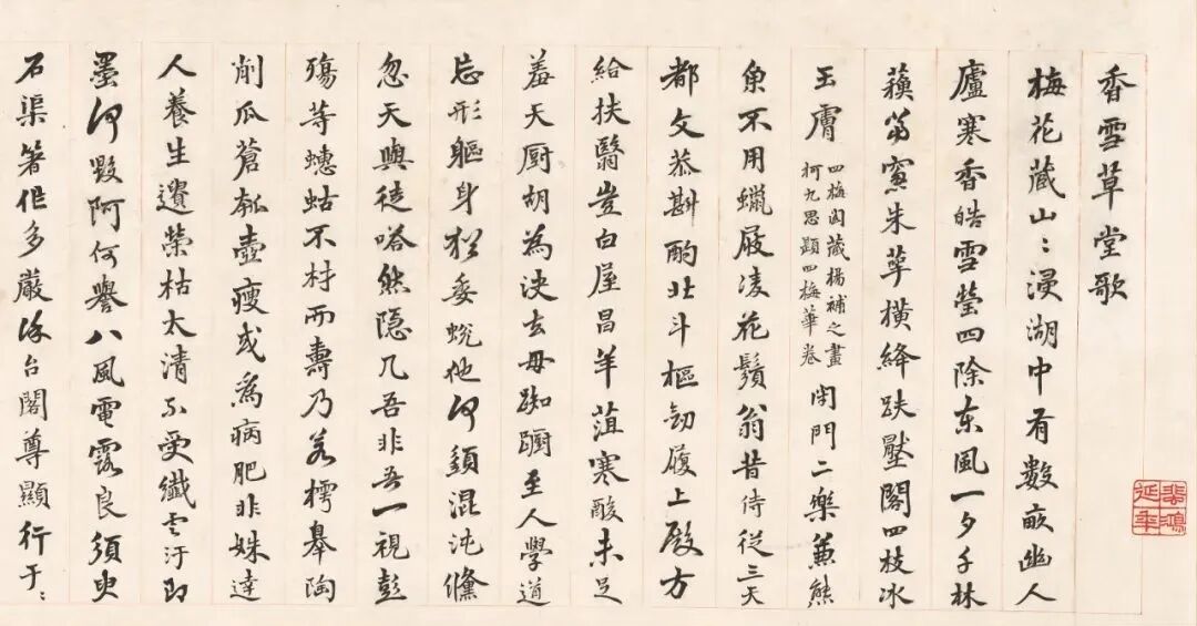 民国十五年,爱国名士李根源辞去国会代表隐居吴中,游苏州光福山,至张家涧寻访潘遵祁墓,“折往倪家巷,经香雪草堂,潘顺之先生遵祁别业也。中有四梅阁,以宋人杨补之《梅花卷》得名。俞曲园樾联云:霄汉早归来,最好卜居近;香雪云烟同供养,依然偕隐在湖山。”(李根源《吴郡西山访古记》)看,距离我们最近的访客,记下苏州潘氏名门别业“香雪草堂”的晚景,一晃也快百年了。2021西泠秋拍征得何绍基题匾、程庭鹭为潘遵祁所作《香雪草堂图卷》,并诸家题跋。一家之学,一地之风,草堂以香雪为名,西圃疏影,衔着梅魂,从某片历史的天空中偶然降临,拼布出百感尘海,笔墨为草堂留品,它并非始于废墟,也不愿终于丘荒。约在光绪庚子年前后,潘遵祁最小的儿子潘季孺在世纪之交翻检旧箧。前辈鸿儒何绍基隶书“香雪草堂”额(即西泠卷引首)带着陈事梦想,复登潘氏之堂。何绍基晚年寓苏,较香雪草堂主人潘遵祁年长近十岁,与潘氏家族多有往来:据《清职官年表会试考官年表》,道光十六年(1836),38岁的何绍基参加会试,正考官是潘祖荫的祖父潘世恩,也就是潘遵祁的伯父。《何绍基日记》手稿较早记载何绍基与潘氏交往的,在道光十九年十一月初三日,“早拜潘顺之(即潘遵祁)、补之,得观《升元帖》。承赠三松老人墨刻。游虎邱。在何绍基与潘氏交往进程中,同治乙丑年(1865)是一个值得注意的记忆大年。是年除夕,67岁的何绍基经过一番长谈后向曾国藩辞行,抵达苏州,在吴平斋抱罍室住下。在吴门期间,何绍基多有访游书题,其中就为潘遵祁题《石湖懒渔诗集》、《石湖懒渔图》、《潘顺之香雪诗钞》,两人交情至少三十年以上。(《东洲草堂诗钞》卷二十七载)。![]()