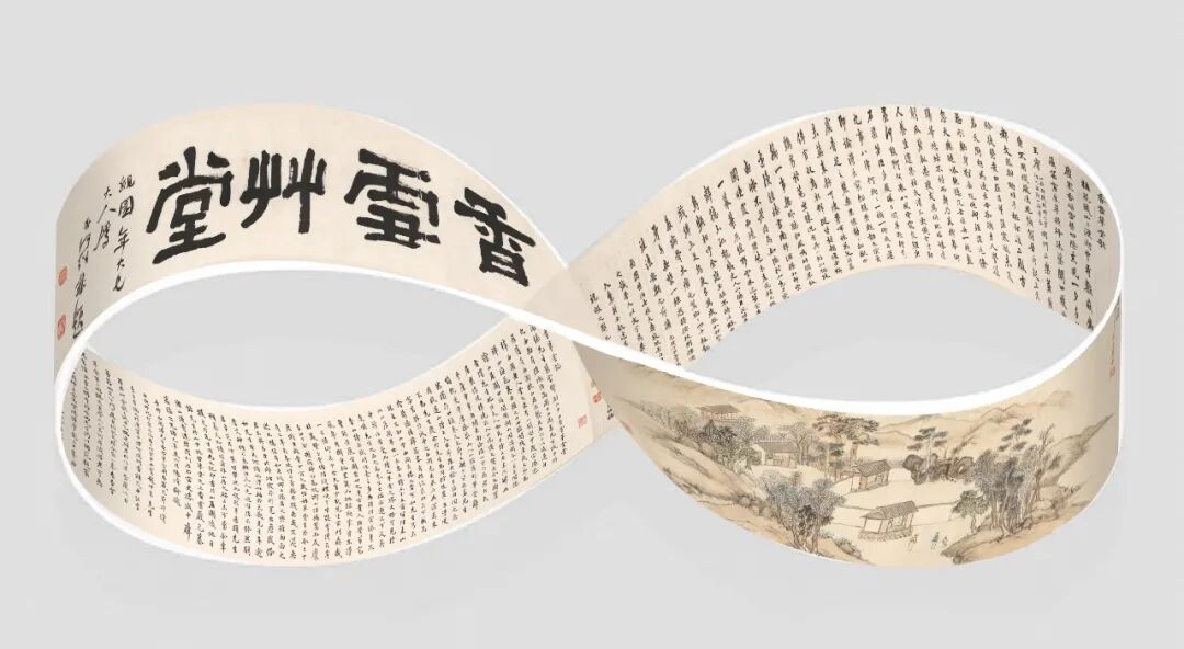 从潘遵祁借外祖之名以梅建园、有夫妻之好、父子相传,几经战乱,这个画卷不同的部分在不同的时间得失现隐,不同时代的文化人又不厌其烦地纪录、复述草堂的历史和历史中的草堂。一方面,几代人遵循着言语的惯例,那种长跋和抄录(展卷敬录)保有着特殊的仪式感;另一方面,历史之手像在玩华容道游戏一样,拼来补去,打破了时序,让不同时代叙事共时性地并陈,构成一个交织往复的莫比乌斯环。共同恪守的话语信条穿梭成卷,只要还有记忆,这种力量便会创造出人所思恋。