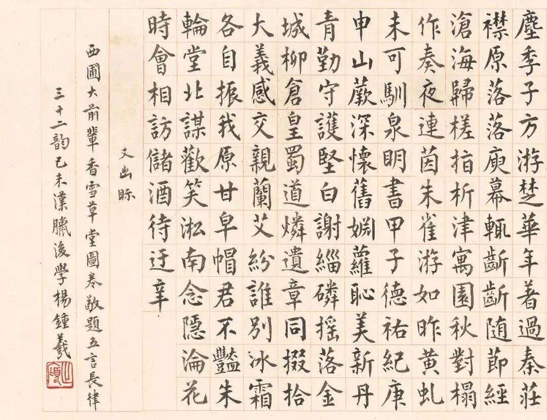 杨钟羲与潘季孺都是清末藏书家。杨氏为潘遵祁后学,跋记称西圃大前辈,诗文著录于1920年11月25日《東方雜志》24号刊·文苑·詩,题目为《西圃前輩香雪草堂圖卷爲令子季儒題三十二韻》。五言长律以“牓字标何逊,横图补顾璘。俞楼文斐亹,李叟句嶙峋”开篇,虽然写得是南北朝时期著名的写梅诗人何逊、明代江东才子顾璘,但”何、顾、俞、李“的搭配,暗示其所见卷本仍为顾鹤逸所绘画、![]()