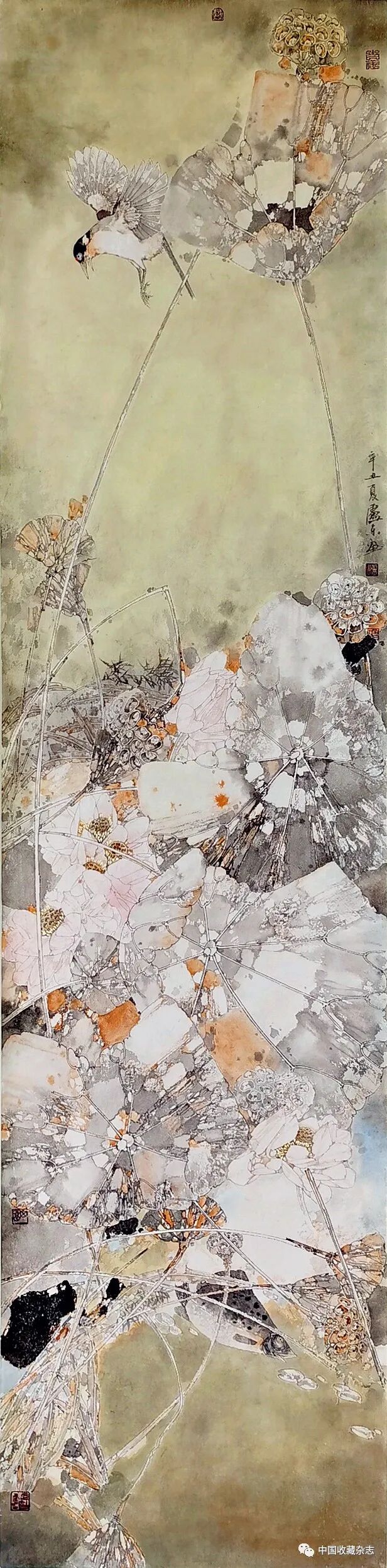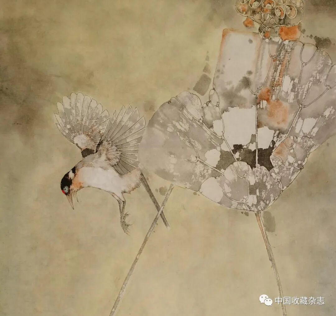 初观此画,画面下方盛开的荷花夺人眼目,但转瞬又会被中段大幅留白吸引,而画面上方冲天而起的莲叶及正做俯降之状的水禽,又为画面增添动感、生机与和谐。