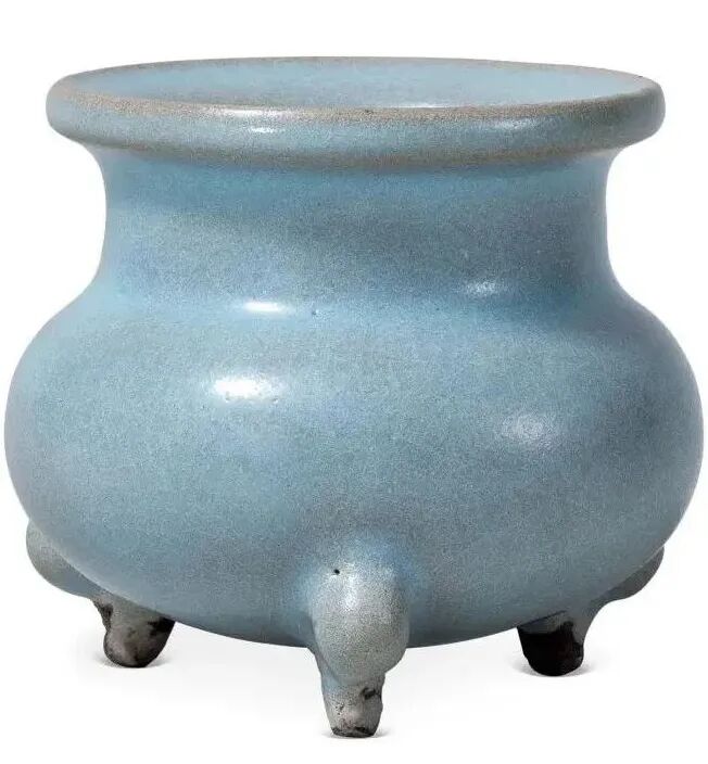 此炉唇口,直颈,溜肩,鼓腹,下承三足。造型极为简约,形制亦颇精巧。通体施钧窑月白釉,朴雅沉着,澄净透明,釉面光洁,口沿处挂釉较薄,稍有开片。在胎骨衬托下呈灰色。炉挂釉至炉底,足尖无釉露胎,质地较细密。整器娇小,乃弃珍材、废繁奢、破窠臼,抟泥幻化而成,不究工致对称,但取瞬霎抽象,别具一格。