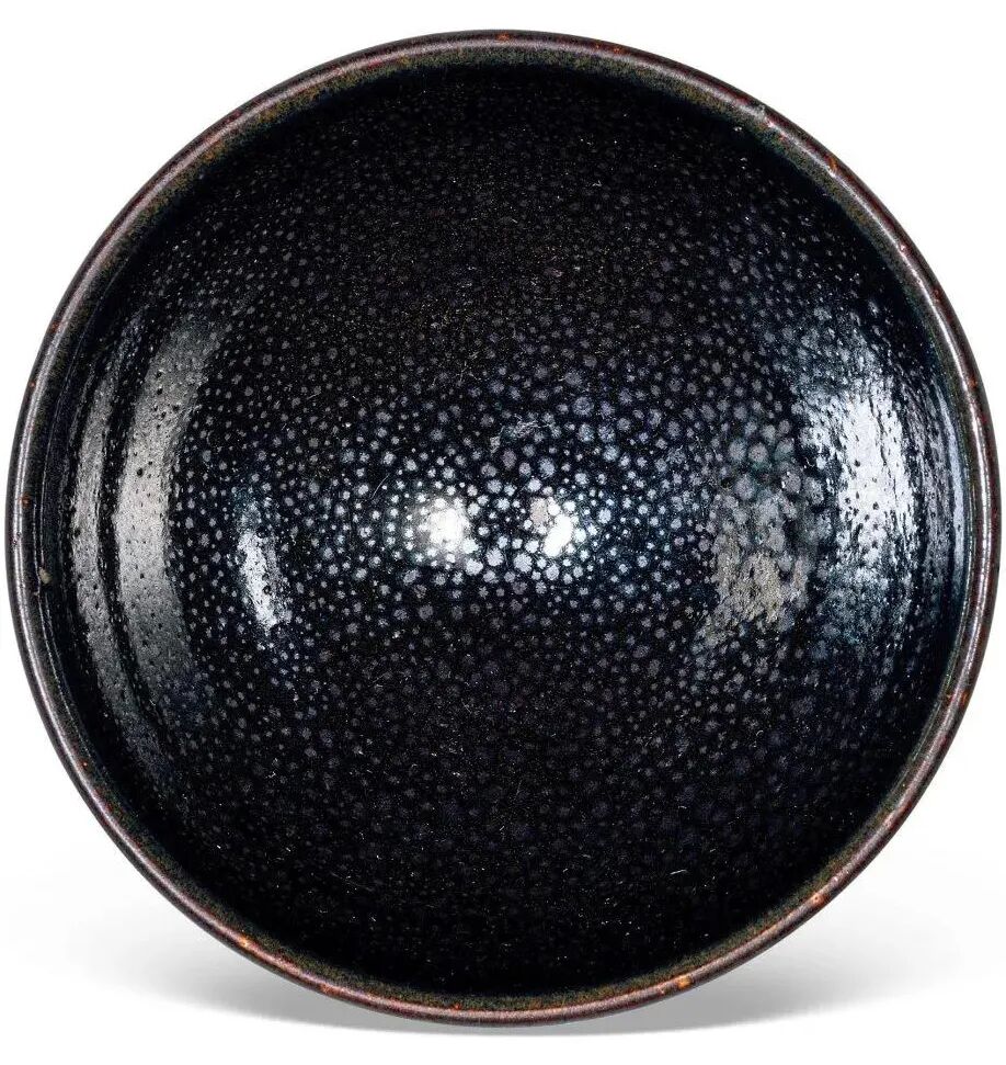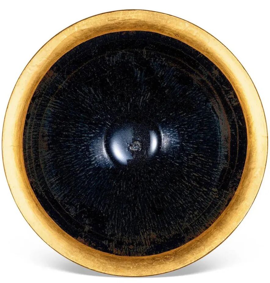 拍品为建窑油滴盏作品佳作之一,形制规整,包银口,口沿一圈略有收束,线条极为美观,外侈幅度使其更形秀丽,略作斗笠式。整器满施乌金釉,外壁施釉近底,釉层较厚并局部有垂挂。盏内釉面满布银蓝色的油滴斑,在光亮处观察,似漆黑夜空中的满天星斗,色泽自然,美不胜收,为建窑黑釉精品之作。