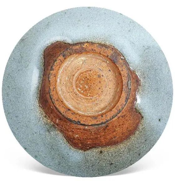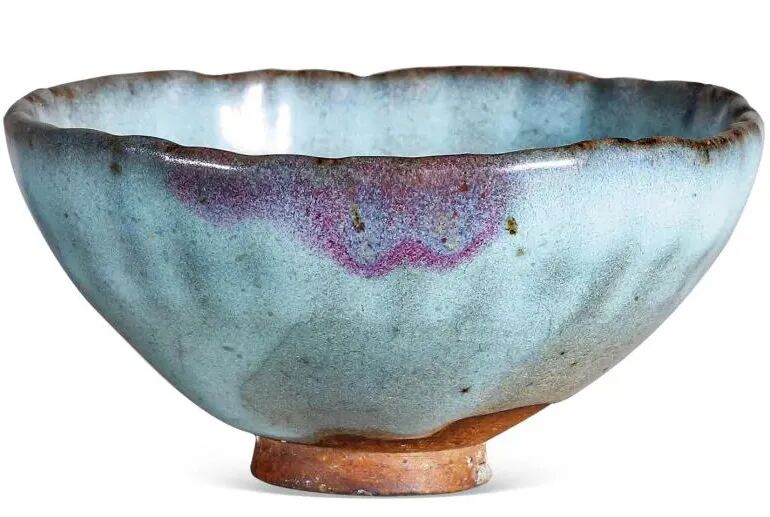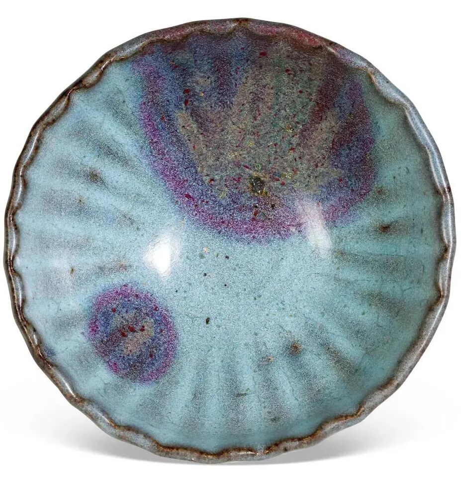 本品器形小巧,色泽怡人。呈菊瓣状,口内敛,条棱形深弧壁,下腹渐收,圈足。口和腹壁上雕出秀丽的菊瓣,整器通体施天蓝釉,淡雅莹润,口沿处经窑变形成自然酱色,盏心晕染一抹紫斑,在天蓝釉的衬托下更显绮丽曼妙。钧瓷之美胜在釉色,三分人力,七分天成,其间色彩的流淌与幻化,非巧思可以成就,尤以钧窑挂紫最为典雅,釉彩之绚丽宛若晚霞,而釉质之细润,犹似一泓静谧湖水。其烧造颇为周折,因釉本身乳浊粘稠、流动缓慢,极易形成斑斓、交织的现象,乃至一窑一火烧制的钧瓷,变化万端,无一相类。