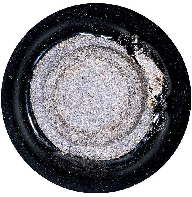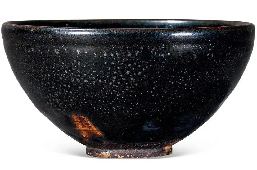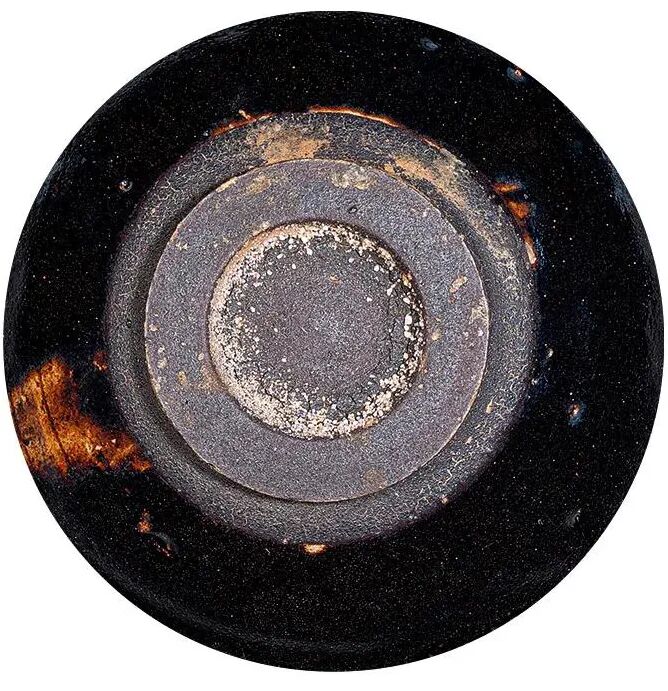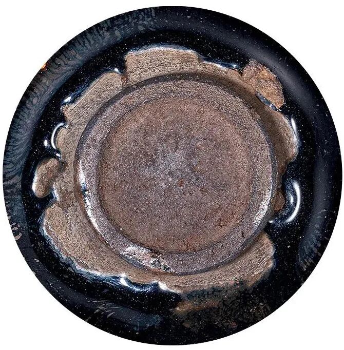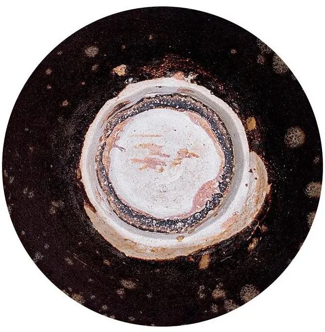本品敞口,弧壁,圈足,弧线优美,小巧雅致,内外满施黑釉,黑釉上点撒油滴状铁锈斑纹,不规则的分布在盏中,远观之犹如浩瀚星际,繁星熠熠,近观之如雪花片片,有踏雪寻梅之意境,韵味独具。盏外施釉至圈足处,圈足露胎处涂有黑色护胎釉,为怀仁窑最为明显的一个特征。