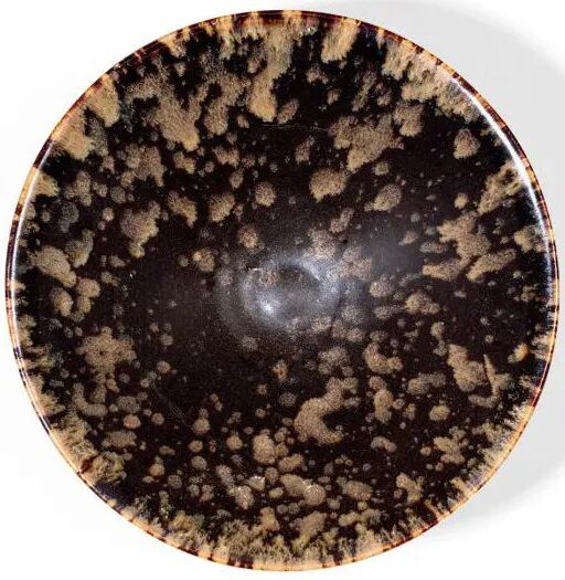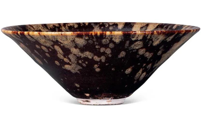 玳瑁釉是吉州窑变色中极有特色以及富有美感的一种,以其色形似玳瑁而知名,其工艺为先施含铁较高的釉料,然后随意甩洒较浅色釉料,两种色釉入窑烧制过程中幻化融合,形成千变万化的色斑,传世吉州窑玳瑁釉器除盏外,还有瓶、罐、炉等。本品敞口,斜直壁,因形似斗笠,故名斗笠盏,下承小圈足。底部露胎,胎色米黄,间有黑色杂质,烧结颇为致密。器内外施黑釉,洒以黄色釉,釉色在窑火中交织变化,形成虎皮斑,棕黄色釉层自口沿向内外碗壁流下,形成水流状斑点,由内观之呈放射状,色泽有如玳瑁,瑰丽润泽,协调而富于变化。