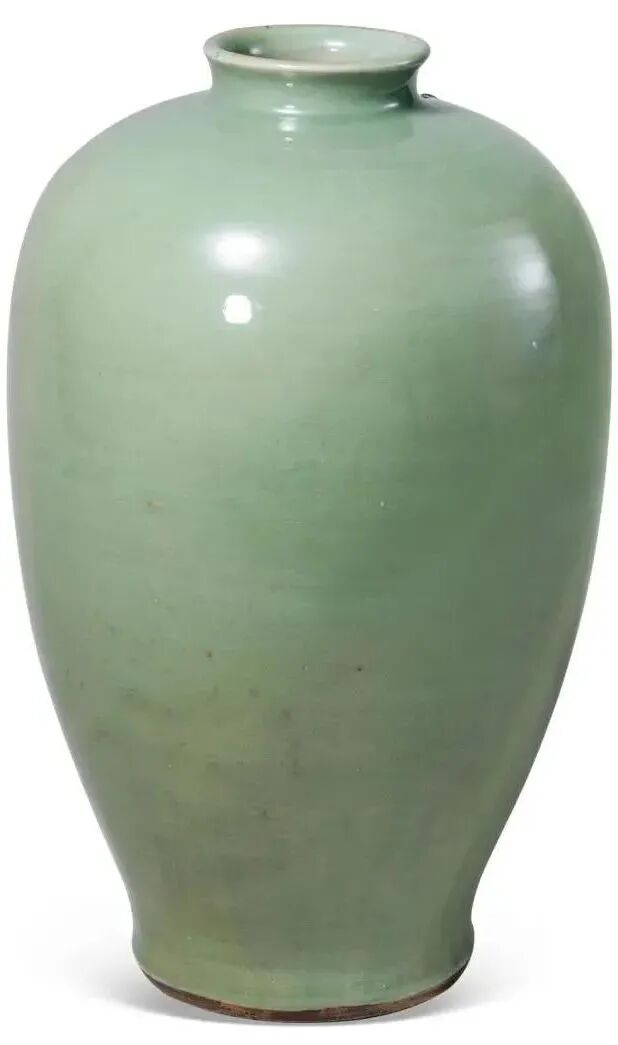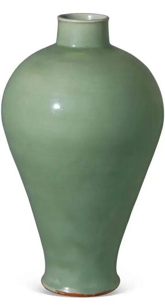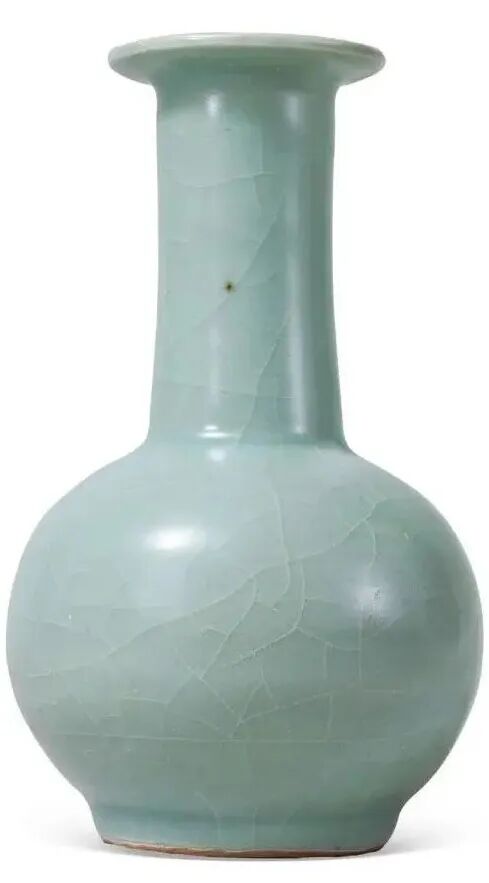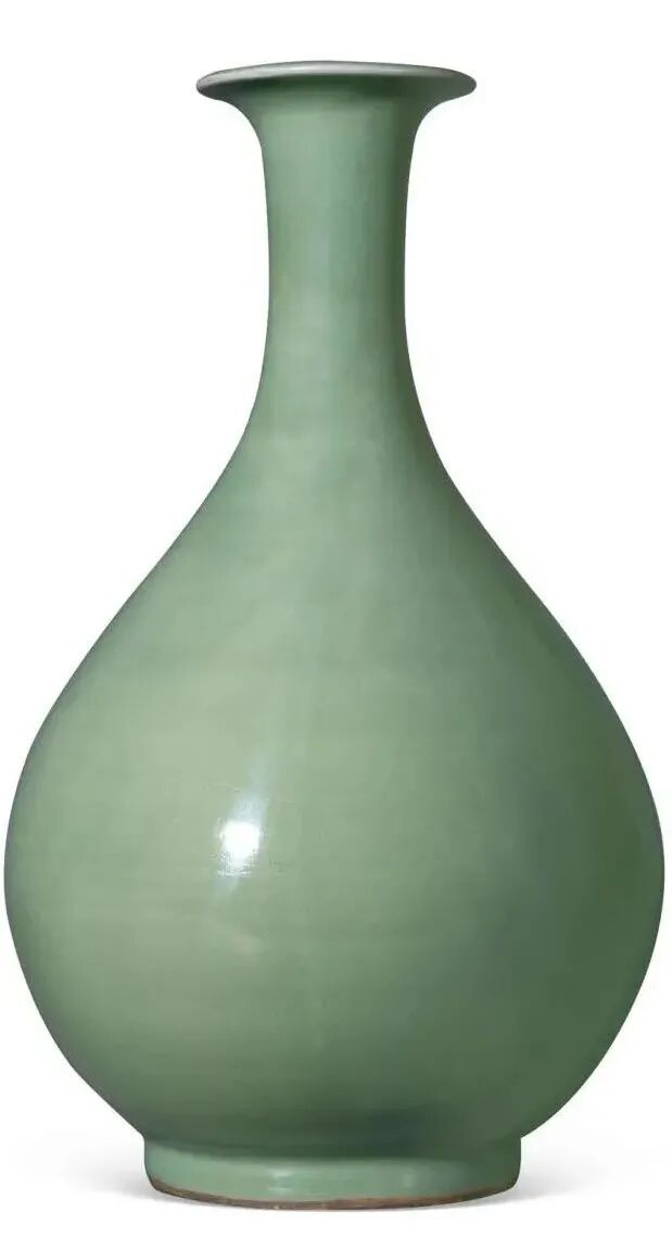 拍品撇口,长直颈,溜肩,梨形腹及底内收,下承圈足,器型比例协调,优雅怡人。器形修长饱满,秀美挺拔,曲线玲珑,线条优美。加之胎质细腻,胎体较厚,全器施青釉,釉色清淡莹润,人称「橄榄青」者,为元龙泉之佼佼者。光素润泽,釉色质美,映衬其器形比例之秀雅,具有鲜明的明早期龙泉青瓷时代特征。