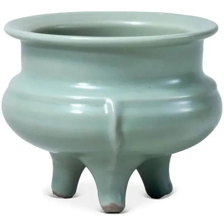 此炉仿古代青铜鬲造型,龙泉窑从宋代开始多有烧造。本品端正浑厚,折沿,束颈,鼓腹,口边线条自颈下至腹部弧线内收到足部,曲线流畅,形成炉外边「S」形曲线。三条出戟棱仿青铜器装饰,关注公众号:高古瓷。自腹部到足一路凸起,圆润而不张扬。三足鼎立,古雅大方。胎骨致密,底足露胎。通体施肥厚的青色釉,釉色滋润。造型古朴,线条比例规整,具有强烈的艺术感染力,寄托了古代文人书斋案头赏玩之雅趣。