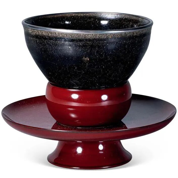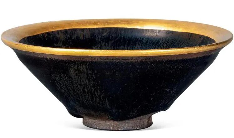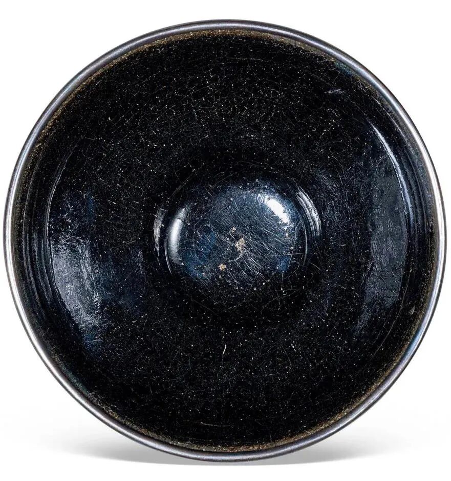 建盏黑釉耀眼,釉色变化多样,窑烧时,釉里气泡爆裂,流釉成丝丝细纹,称之兔毫(日文「禾目」),或釉面圆点致密之样,称为油滴(日文「油滴」),色调红褐至耀蓝皆可见,褐釉兔毫可说最具代表性,泛蓝油滴釉则是盛名且罕见,二者之间可见无数种釉色变化,决定建盏之价值与魅力。此盏作仰置之斗笠状,敞口撇唇,尖底急收,下承小圈足,足底无釉,腹内外满施黑釉,内外腹壁上伴生有窑变之「兔毫」,细毫隐隐闪耀银光,乃禾目品类中珍稀者。