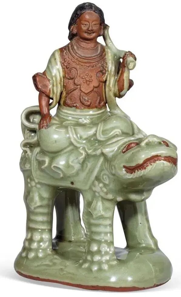 文殊菩萨为四大菩萨之一,常相伴出现于各类艺术形式表现之中,以表智慧和践行。文殊菩萨表智,以智慧著称。与普贤菩萨同侍释迦牟尼佛,是释迦牟尼佛所有弟子的上首。本尊文殊菩萨结跏趺坐于坐骑青狮之上,脸型饱满,慈眉善目,鼻梁秀挺,气宇轩昂,左手持如意,右手置于膝上,袒胸露袖,肩披飘带,胸前有如意形璎珞配饰,神情悠然自得。通体施青釉,釉色翠绿深幽。人物的脸、胸、手以及坐骑的眼、嘴和牙齿等部位均不施釉料,露出铁红色胎质,与厚润之青秞互相比衬,相得益彰。狮子周身雕饰锦缎,装饰华贵,狮鞍暗刻花卉纹,四角垂以花型小坠,釉面肥厚,润如凝脂,精美十分。