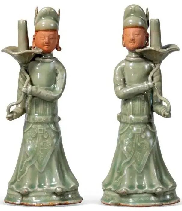 本器采用堆塑、刻划等多种工艺而成,造型新颖,为龙泉窑的少见品种。人物头戴官帽,脸庞圆润,笑眉笑眼,凝神远眺。身着交颈长衫,腹部腰带拖曳,双手于身前执荷,荷茎粗韧弯折,荷花于肩铺展,荷叶之内巧设一管,以为插蜡烛之用,极为巧妙。人物的脸部、涩胎无釉,而呈现出赭红色,以体现肌肤本色;而其他部分均施青釉,肌肤与衣衫对比鲜明,配映着温润翠莹的厚釉,独具美感,为龙泉窑特有之装饰艺术。此种器型的龙泉窑作品传世极罕。