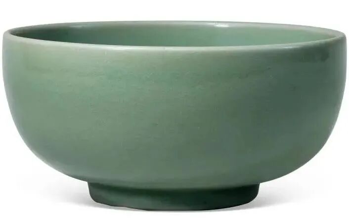此碗为敦式,直口,深弧腹,圈足,造型敦实端庄,气息古拙浑厚。通体内外施青釉,丰厚滋润,色泽青绿,颇为雅致,其釉厚腴温润,碧翠怡人。圈足裹釉,内留涩圈一周,为垫烧所用,属明早期处州龙泉官窑佳作。此器为精致之器,工艺卓越,形制规整,沉稳大方,加之保存至今状态完好,实属不易,乃收藏之佳品,类似作品见于两岸故宫等重要收藏机构。